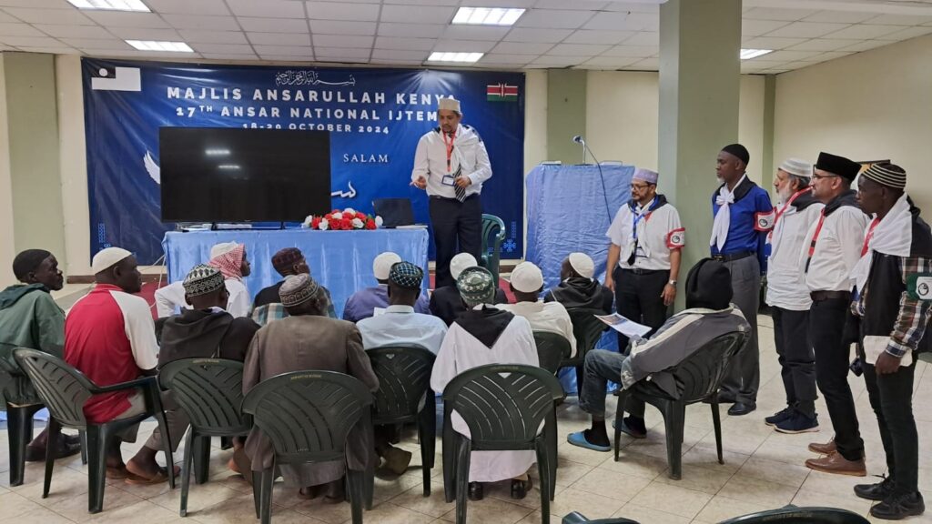 سالانہ اجتماع مجلس انصار اللہ کینیا: مورخہ ۱۸و۱۹؍اکتوبر ۲۰۲۴ء بروز جمعۃالمبارک و ہفتہ نیروبی میں ہی مجلس انصار اللہ کینیا کا سترھواں (۱۷) سالانہ اجتماع منعقد ہوا۔ ۱۸؍اکتوبر کوبعد از نماز جمعہ تقریب پرچم کشائی منعقد ہوئی جس کے لیے جملہ انصار مشن ہاؤس کے لان میں ریجن وار لائینوں میں کھڑے ہوئے۔ خاکسار نے مجلس انصاراللہ کا جھنڈا جبکہ مکرم ناصر محمود طاہر صاحب امیر و مبلغ انچارج کینیا نے قومی پرچم لہرایا جس کے بعد دعا ہوئی اور جملہ انصار احمدیہ ہال میں چلے گئے جہاں ایم ٹی اے پر حضرت خلیفۃ المسیح الخامس اید ہ اللہ تعالیٰ بنصرہ العزیز کا خطبہ جمعہ سنا گیا۔ بعدازاں اجتماع کا افتتاحی اجلاس شروع ہوا۔ تلاوت قرآن کریم، عہد اور نظم کے بعد نائب صدر صف دوم مکرم سید عقیل احمد شاہ صاحب نے اجتماع میں شریک ہونے والے انصار کو خوش آمدید کہا اور اجتماع کے پروگراموں کی تفصیلات بتا کر تمام انصار کو اجتماع کے تمام پروگراموں میں شامل ہونے اور ان سے بھرپور فائدہ اٹھانے کی تلقین کی۔ جس کے بعد حضرت محمد مصطفیٰﷺکے معجزات کے بارے میں ایک ایمان افراوز تقریر مکرم بشارت احمد ظاہر صاحب مبلغ سلسلہ نے کی۔ پھرمجلس انصار اللہ کینیا کے تحت ایک ورکشاپ ہوئی جس میں شعبہ تربیت، تبلیغ، تجنید، مال اور عمومی کے قائدین نے انصار کو اپنی اپنی قیادت کے پروگراموں، سکیموں اور ان پر عمل درآمد سے متعلق تفصیلی معلومات دیں اور سوالات کے جواب بھی دیے۔ اسی طرح میدان عمل میں درپیش مشکلات پر بھی تبادلہ خیالات کیا گیا۔ اس کے بعد علمی اور ورزشی مقابلے منعقد ہوئے اور نماز مغرب و عشاء ادا کی گئیں۔
