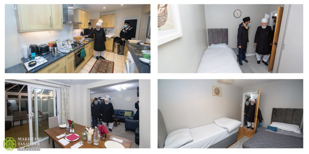 حضورِانور نے نچلی منزل پر تشریف لے جانے سے قبل کمروں اور ان میں موجود کل بستروں کی تعداد کی بابت استفسار فرمایا۔ یاد رہے کہ سرِدست اس گیسٹ ہاؤس میں چار قابلِ رہائش کمرے ہیں جن میں آٹھ بستر لگائے گئے ہیں۔