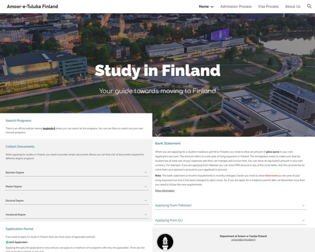 اس ویب سائٹ کا مقصد ان طلبہ کو مدد فراہم کرنا ہے جو فن لینڈ میں تعلیم حاصل کرنے یا وہاں منتقل ہونے کے خواہش مند ہیں۔ ویب سائٹ پر مندرجہ ذیل موضوعات پر تفصیلی راہنمائی فراہم کی گئی ہے۔ فن لینڈ میں تعلیم کے مواقع: فن لینڈ کے اعلیٰ تعلیمی نظام، یونیورسٹیز اور سکالرشپ کے متعلق معلومات۔ بیچلرز کی ڈگری سے لے کر پی ایچ ڈی تک کی تعلیم کی معلومات اس ویب سائٹ پر موجود ہیں۔