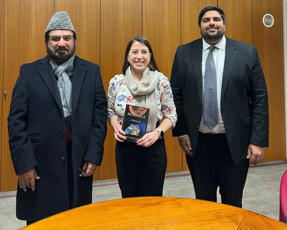 ممبر نیشنل اسمبلی سے ملاقات: ۹؍دسمبر ۲۰۲۴ء کو دوسری بار منتخب ہونے والی علاقہ کی ممبر نیشنل اسمبلیMadame Louise Morelسے ان کے دفتر میں مکرم محمداطہر کاہلوں صاحب صدر جماعت احمدیہ سٹراس برگ اور خاکسار(مبلغ سلسلہ) کو ملاقات کرنے کا موقع ملا۔ موصوفہ سے یہ ہمارا پہلا رابطہ تھا۔ نصف گھنٹہ کی اس ملاقات میں جماعت احمدیہ کا قیام، اس کے مقاصد، نظام خلافت، دیگر مسلمانوں سے فرق بطور خاص جہاد اور توہین مذہب کے حوالے سے تفصیلاً گفتگو ہوئی۔ نیز دنیا میں جماعت احمدیہ کی تبلیغ اسلام اور خدمت خلق کی مساعی کا ذکر کیاگیا۔ دنیا کے بدلتے ہوئے حالات، ممکنہ تیسری عالمی جنگ کے تناظر میں قیام امن سے متعلق امام جماعت احمدیہ کی کاوشوں کا ذکر کیا گیا۔ ملاقات کے آخر میں حضور انور ایدہ اللہ تعالیٰ بنصرہ العزیز کی کتاب ’’عالمی بحران اور امن کی راہ‘‘ پیش کی۔