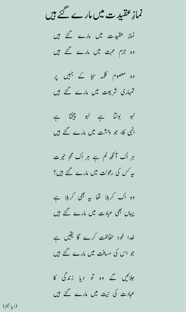 نمازِ عقیدت میں مارے گئے ہیںوہ جرمِ محبت میں مارے گئے ہیں وہ معصوم کلمہ سجا کے جبیں پرتمہاری شریعت میں مارے گئے ہیں لہو بولتا ہے لہو چیختا ہےانہی کا، جو وحشت میں مارے گئے ہیں ہر اک آنکھ نم ہے ہر اک محوِ حیرتیہ کس کی رعونت میں مارے گئے ہیں؟ وہ اک کربلا تھا یہ بھی کربلا ہےیہاں بھی عبادت میں مارے گئے ہیں خدا خود حفاظت کرے گا یقیں ہےجو اس کی مسافت میں مارے گئے ہیں جلائیں گے وہ تو دیا زندگی کاعبادت کی نیت میں مارے گئے ہیں (دیا جیم) مزید پڑھیں: اُس کی ہر اک بات پر آمین کر