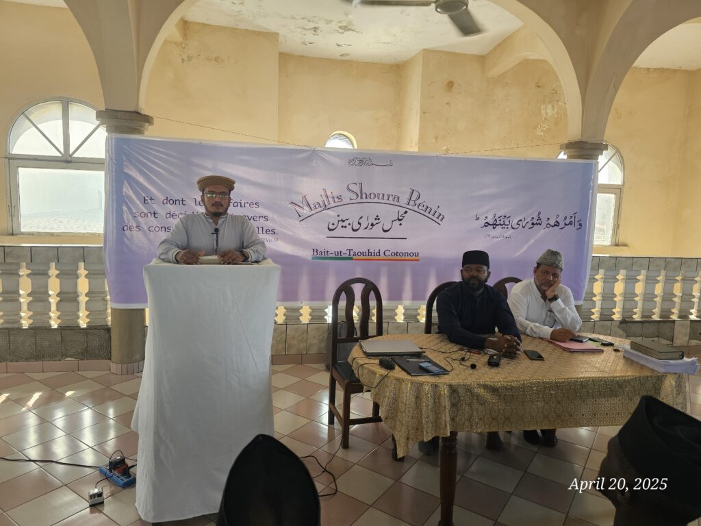 محض خدا تعالیٰ کے فضل و کرم کے ساتھ جماعت احمد یہ بینن کو مورخہ ۱۹ و ۲۰؍اپریل ۲۰۲۵ء کو بیت التوحید کو تو نو میں مجلس شوریٰ کے بابرکت انعقاد کی توفیق ملی۔ نمائندگان مجلس شوریٰ ۱۸؍اپریل کو ہی پہنچ گئے تھے۔ ۱۹؍اپریل بروز ہفتہ صبح ساڑھے چار بجے نمازِ تہجد باجماعت ادا کی گئی جو کہ حافظ حلیم احمد صاحب نے پڑھائی جس کے بعد محترم عارف محمود صاحب مبلغ سلسلہ نے اطاعت خلافت کے موضوع پر درس دیا۔ بعد ازاں محترم محمد لقمان بصیرو صاحب امیر جماعت احمدیہ بینن نے نمازِ فجر پڑھائی۔