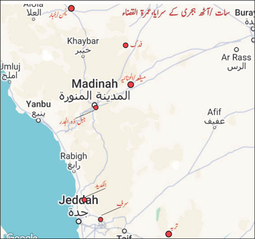 دیگر مقامات فدک، ذوالحلیفہ، مرالظہران، یأجج، دارالندوۃ، حدیبیہ اورسرف وغیرہ کا پہلےمضامین میں ذکر کیا جا چکاہے۔