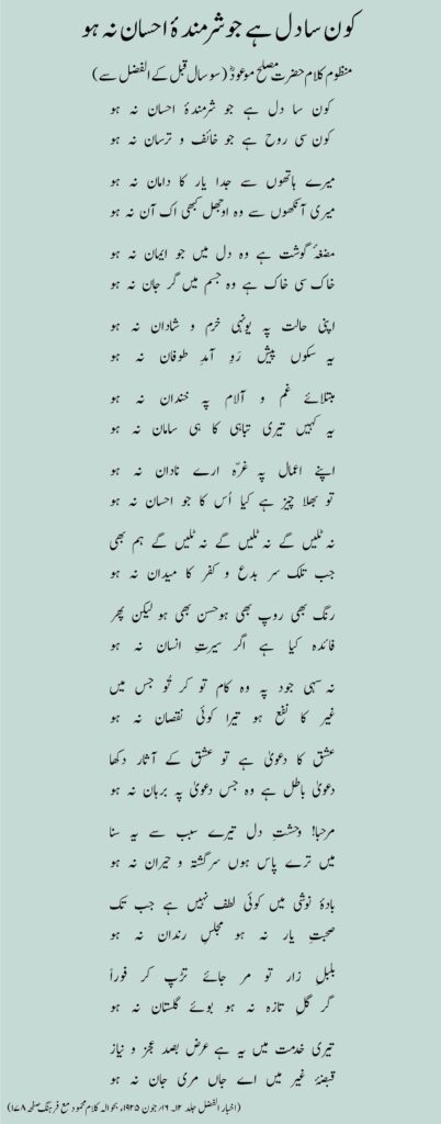 (اخبار الفضل جلد ۱۲۔ ۱۶؍جون ۱۹۲۵ء بحوالہ کلام محمود مع فرہنگ صفحہ۱۷۸)