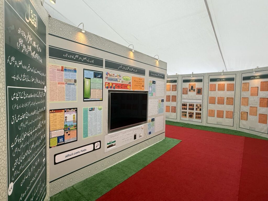 چار میٹر کی دیوار کھڑی کی گئی ہے جس کے ایک جانب سوشل میڈیا پرالفضل انٹرنیشنل کی کاوشوں کی ایک جھلک جبکہ دوسری جانب بچوں کے الفضل کا تعارف اور سکرین پر بچوں کے لیے الفضل کے ایک ویڈیو پروگرام کو آویزاں کیا گیا ہے۔