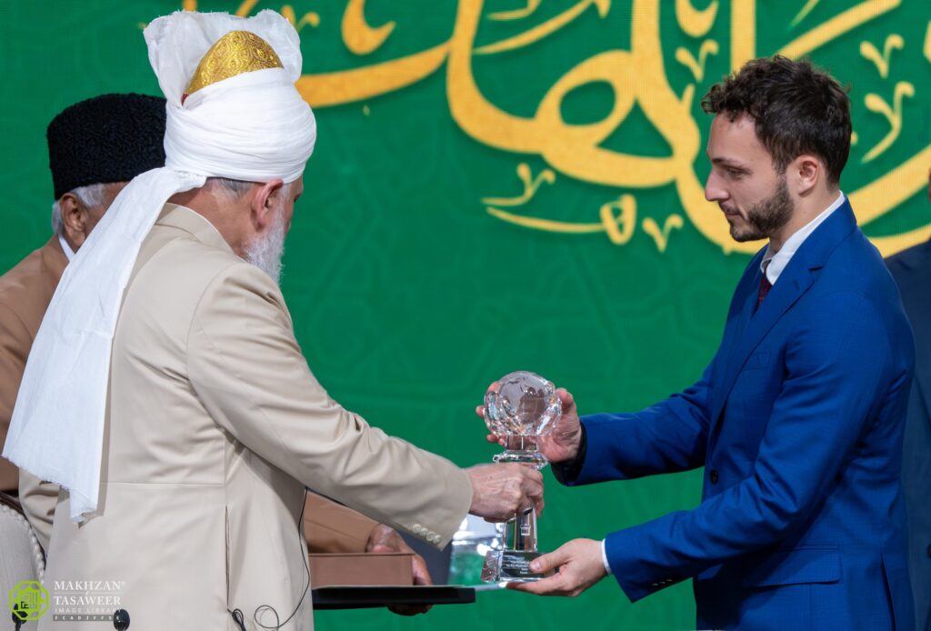 بعد ازاں مکرم امیر صاحب یوکے نے سال ۲۰۲۴ء میں احمدیہ امن انعام حاصل کرنے والے اٹلی کے Nicolò Govoni کی امن کے لیے کوششوں کا ذکر کیا جس کے بعد موصوف نے حضور انور سے اپنا انعام وصول کیا۔ بعد ازاں موصوف حاضرین جلسہ سے مخاطب ہوئےاور جماعت احمدیہ کا شکریہ ادا کیا۔
