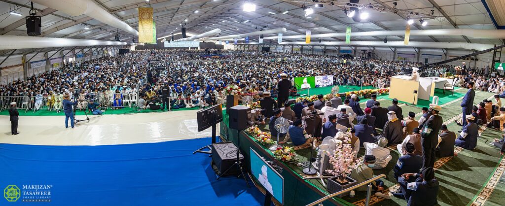 چار بج کر ستاون منٹ پر حضورانور ايدہ اللہ تعاليٰ بنصرہ العزيز منبر پر تشريف لائے اور تمام حاضرين کو السلام عليکم ورحمة اللہ کا تحفہ عطا فرما کر جلسہ سالانہ برطانیہ ۲۰۲۵ء کے اختتامي خطاب کا آغاز فرمايا۔