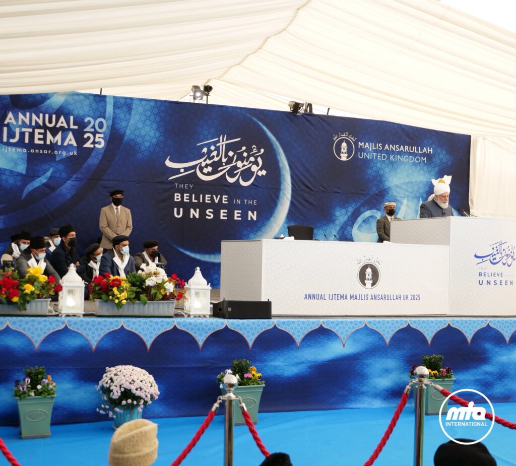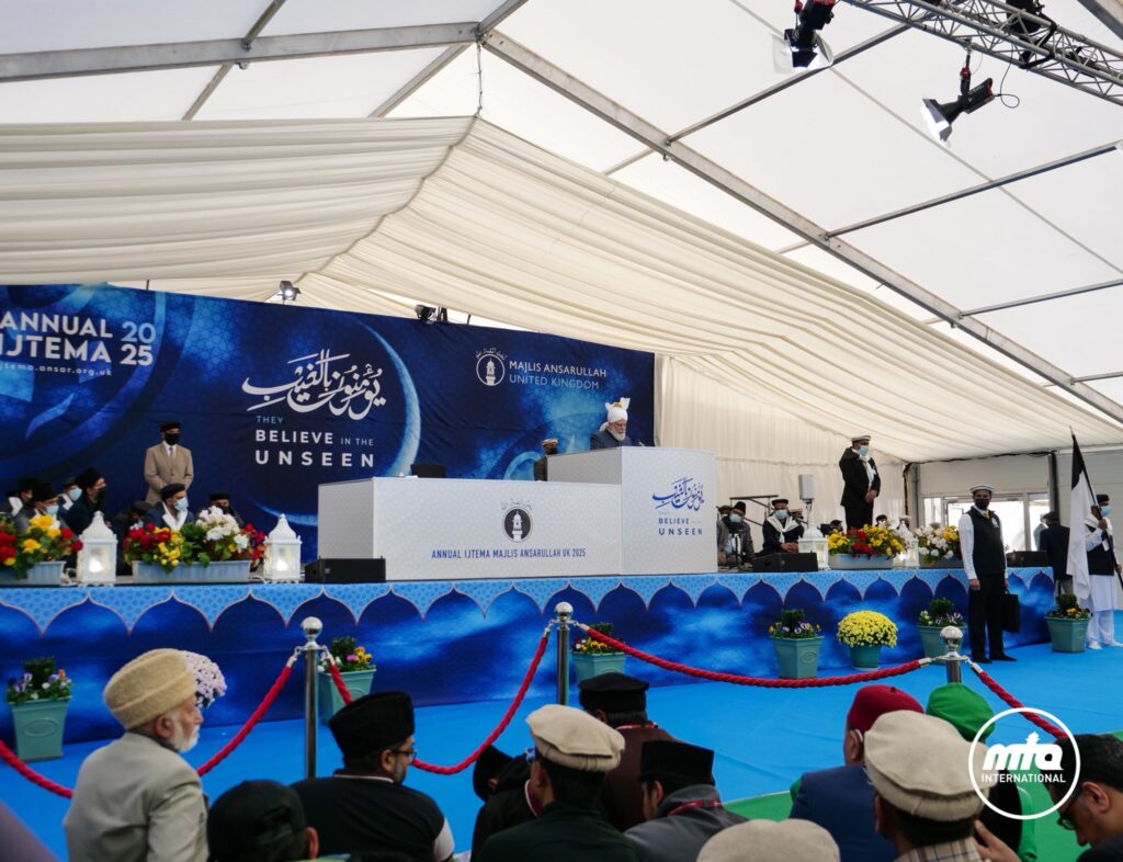 (۲۸؍ستمبر ۲۰۲۵ء، نمائندگان الفضل انٹرنیشنل) اميرالمومنين حضرت خليفةالمسيح الخامس ايدہ اللہ تعالیٰ بنصرہ العزيز نے مورخہ ۲۸؍ستمبر ۲۰۲۵ء بروز اتوار مجلس انصار اللہ برطانیہ کے سالانہ اجتماع (منعقدہ ۲۶تا۲۸؍ستمبر ۲۰۲۵ء) سے بصیرت افروز اختتامی خطاب ارشاد فرمایا۔ یہ خطاب ایم ٹی اے کے مواصلاتی رابطوں کے توسّط سے پوری دنیا میں براہ راست دیکھا اور سنا گیا۔ امسال مجلس انصار اللہ کا اجتماع گلفورڈ میں واقع Hook Lane پر موجود پچاس ایکڑ زمین پر منعقد ہوا جس کا مرکزی موضوع ’’یُؤۡمِنُوۡنَ بِالۡغَیۡبِ‘‘ تھا۔