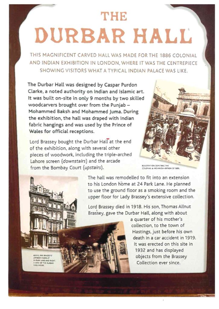 ۱۸۸۵ء میں جناب ملک عمر حیات خان ٹوانہ (والد محترم سر خضر حیات خان ٹوانہ سابق وزیر اعظم متحدہ پنجاب (برٹش انڈیا) حضرت جمعہ خان صاحبؓ کو ان کی صنّاعی کی نمائش کے لیے لندن (England)لے گئے تھے۔ وہاں آپ کو بڑا انعام وا کرام دیا گیا تھا۔ (بھیرہ کی تاریخ احمدیت مؤلفہ مکرم فضل الرحمٰن بسمل صاحب غفاری مرحوم سابق امیر جماعت احمدیہ بھیرہ صفحہ ۱۱۳)یہ سفر بھیرہ سے لاہور بذریعہ لاری، لاہور سے بمبئی براستہ دلی، آگرہ بذریعہ ٹرین اور بمبئی پورٹ سے Dover England بذریعہ Ship ہوا۔ اس ضمن میں یہ بیان کرنا ضروری ہےکہ حضرت میاں محمد بخش صاحب بھیروی مرحوم (محترم ناصر احمد خان صاحب Tooting جماعت کے دادا) حضرت جمعہ خان صاحبؓ کے رفیق کار تھے۔ وہ بھی ان کے ہمراہ لندن گئے۔ (بھیرہ کی تاریخ احمدیت صفحہ۱۱۴) دونوں بزرگوں نے لندن پہنچنے کے بعد زیرنگرانی Caspar Purdon Clarke ( جو کہ انڈین اسلامک آرٹ پر اتھارٹی سمجھے جاتے تھے)South Kensington Museum میں دربار ہال کے لیے صنّاعی کا کام (Crafting؍wood carving)شروع کر دیا۔ اس جاب کی اہم خصوصیات میں سے ایک ہندو ستانی شاہی محل کی مکمل کاپی کرنا اور مقصد جاگیردارانہ ہندوستانی شاہی رہائش گاہ کی عکاسی کرنا تھا۔ اس شاندار دستکاری اور نقش و نگار والے ہال کو مکمل کرنے میں ۱۸۸۵ء۱۳۰۲؍ھ اور ۱۸۸۶ء ۱۳۰۳؍ھ کے دوران نو ماہ لگے۔ اس فن پارہ صنّاعی کام کو ۱۸۸۶ء میں South Kensington Londonمیں نمائش (The Colonial and Indian Exhibition) کے لیے رکھا گیا۔ دوران نما ئش دربارحال کو ہندی جھنڈیوں سے سجایاگیا اور اسے پرنس آف ویلز (Albert Edward) ایلبرٹ ایڈورڈز(۱۸۴۱ء-ا۱۹۰ء)نے سرکاری استقبالیہ کے لیے استعمال کیا۔اس بریسے دربار ہال (The Brassey Durbar Hall)کو نئی حالت میں مکمل صنّاعی کے کام (Crafting؍wood Carving)کے ساتھ ۱۹۳۲ء میں Hastings Museum & Art Gallery, John’s Place, Bohemia؍Cambridge Road Hastingsمیں نصب کردیا گیا۔