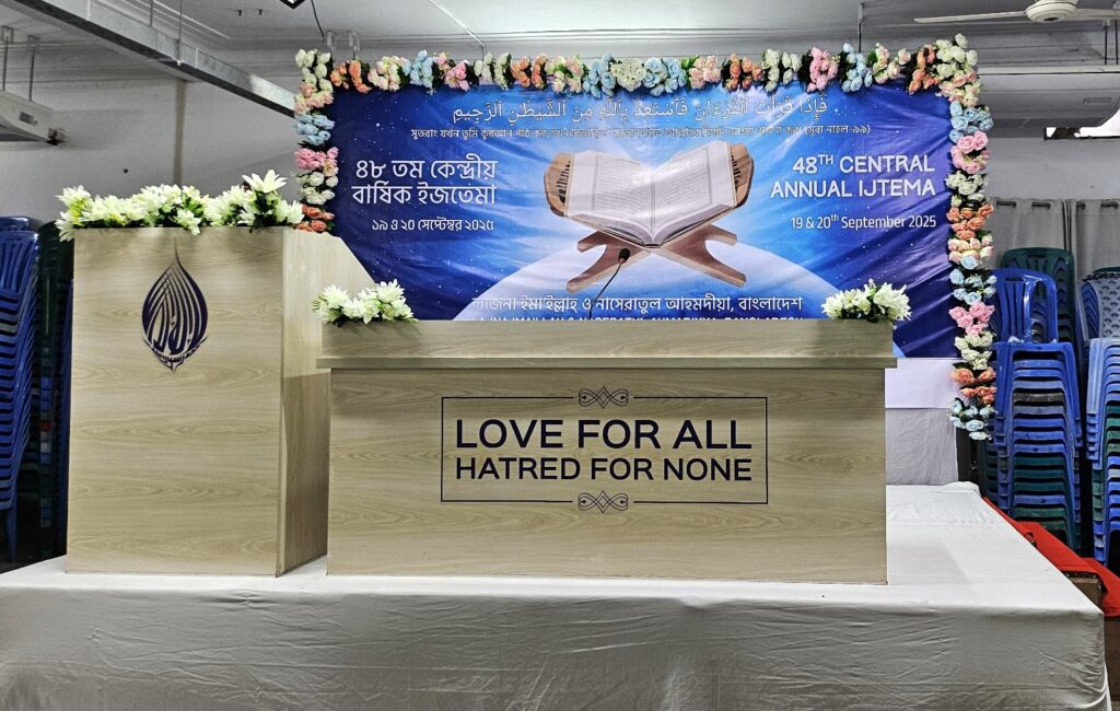 اللہ تعالیٰ کے فضل و کرم سے لجنہ اماء اللہ بنگلہ دیش کا ۴۸واں سالانہ نیشنل اجتماع اور ۳۱ویں نیشنل مجلس شوریٰ مورخہ ۱۹تا ۲۱؍ستمبر ۲۰۲۵ء دارالتبلیغ، بخشی بازار، ڈھاکہ میں نہایت بابرکت ماحول میں منعقد ہوئی۔ امسال اجتماع کا مرکزی موضوع ’’قرآن مجید‘‘ مقرر کیا گیا تھا۔ اجتماع سے قبل ۱۸؍ستمبر بروز جمعۃ المبارک کی شب سے بعض علمی مقابلہ جات کا آغاز ہوچکا تھا جن میں ’قرآن مجید کی استانی‘ کا امتحان بھی شامل تھا۔