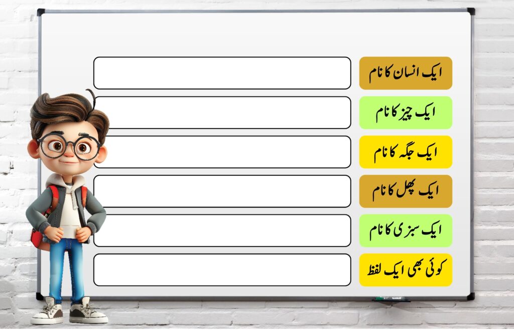 الفاظ بنائیں: المھیمن، نام، مان، میم، مال، لام، لان، نیلم، ہال، ماہ۔