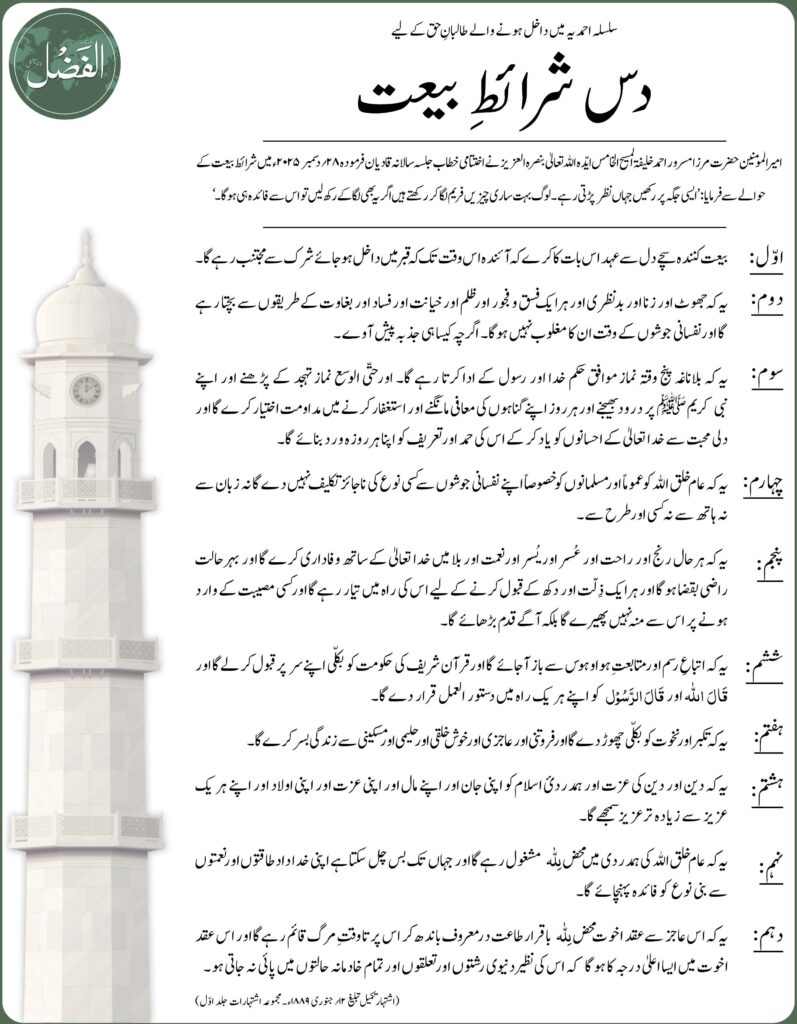 سلسلہ احمدیہ میں داخل ہونے والے طالبانِ حق کے لیے دس شرائطِ بیعت