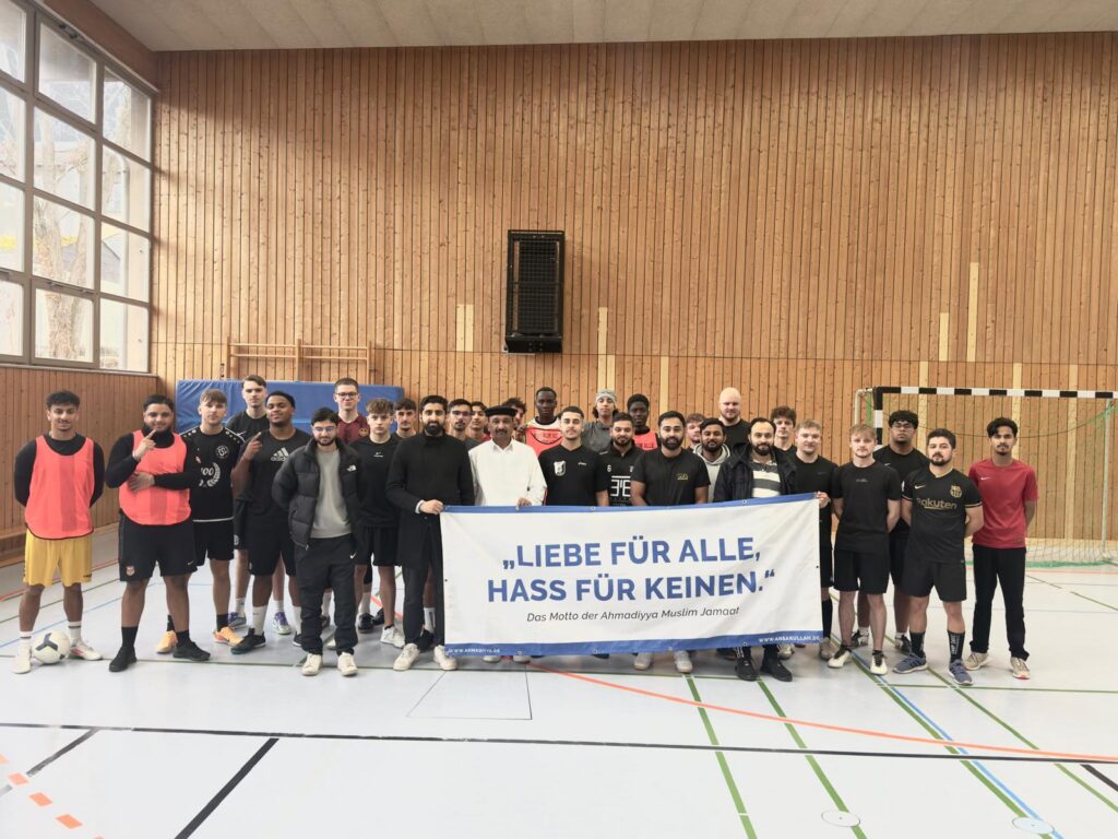 نیز مورخہ ۱۴؍ دسمبر ۲۰۲۵ء کو مجلس Neuwied کو سالانہ فٹ بال ٹورنامنٹ منعقد کروانے کی توفیق ملی جس میں تین جرمن فٹ بال کلبز اور ایک مقامی مجلس کی فٹ بال ٹیم نے حصہ لیا۔ مکرم مدثر احمد صاحب مبلغ سلسلہ نے تمام شاملین کو جماعت احمدیہ کا تعارف پیش کیا اور کھیلوں کے دوران نظم و ضبط کے حوالے سے نصائح کیں۔ دلچسپ میچز کے دوران ہال میں جماعت کا پُر امن محبت کا پیغام بھی بینر پر آویزاں کیا گیا تھا، نیز اسی خوبصورت پیغام کے ساتھ تمام شاملین نے ایک گروپ فوٹو بھی بنوائی۔ پوزیشنز لینے والی ٹیموں اور انصار بھائیوں میں انعامات تقسیم کيے گئے۔ زعیم صاحب مجلس کے ساتھ مل کر کُل ۱۰؍انصار بھائیوں نے اس پروگرام کےدوران خدمت کی توفیق پائی۔