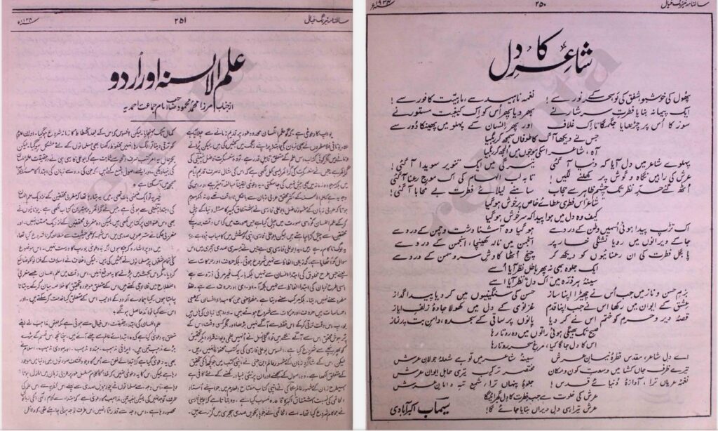 ادبی رسائل کی اس فریاد میں اور بھی کئی آوازیں اٹھیں جنہوں نے ارباب اختیار کو اس حالتِ اسیری سے رَستگاری دلانے کی استدعا کی۔ حضرت مصلح موعود رضی اللہ عنہ نے باوجود گوناگوں مصروفیات کے ان درپیش حالات میں اردو کی سربلندی اور ترقی کے لیے خاص طور پر توجہ فرمائی اور اس کو فروغ دینے کے اقدامات میں ادبی مضامین کے علاوہ اپنی مدبّرانہ رائے سے بھی نوازا۔ اس سلسلے میں آپؓ نے ’’شعر‘‘ کے عنوان سے ایک اچھوتا مضمون لاہور سے شائع ہونے والے ایک رسالے ’’ادبی دنیا‘‘ کو بھجوایا جو اس رسالے کی اشاعت مئی ۱۹۳۰ء میں شائع ہوا۔ یہ مضمون اردو ادب کے متعلق آپؓ کی علمی وسعت کے علاوہ عربی، انگریزی اور جرمن ادب کی واقفیت کو بھی عیاں کرتا ہے۔ اس مضمون کے متعلق رسالہ ادبی دنیا کےآنریری ایڈیٹر جناب مولانا احسان اللہ خان تاجور نجیب آبادی نے اسی شمارہ کے آغاز میں لکھا: ’’ملک کے ایک مشہور مذہبی رہنما جن کی روحانی عظمت کا سکہ ان کے لاکھوں مریدوں ہی نہیں بلکہ امتیوں کے دلوں پر بیٹھا ہوا ہے اور جو اپنی مسند خلافت سے احکام الٰہی کی تبلیغ اور مذہبی تلقین ہی کو اپنا منصب خیال فرماتے ہیں، ادبی دنیا ان کی مقدس مصروفیتوں میں بھی خلل انداز ہوئے بغیر نہ رہا۔ اس نمبر میں ’’ابن الفارس‘‘ کے نام سے جو بلند و گراں مایہ مضمون شائع ہو رہا ہے، انہی کی خامہ تقدس چکاں کی تراوش ہے۔‘‘(ادبی دنیا لاہور، مئی ۱۹۳۰ء صفحہ ۳۲۳)