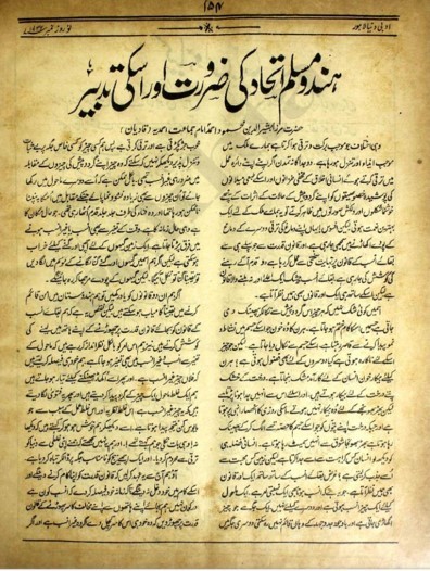 ادبی دنیا لاہور کے نو روز نمبر ۱۹۳۲ء میں صفحہ نمبر ۱۵۴ تا ۱۵۶ پر حضور رضی اللہ عنہ کا مضمون ’’ہندو مسلم اتحاد کی ضرورت اور اس کی تدبیر‘‘ شائع ہوا جس کے آغاز میں تحریر فرمایا: ’’وہی اختلاف جو موجب برکت و ترقی ہوا کرتا ہے ہمارے ملک میں موجب ایذاء و تنزل ہو رہا ہے۔ دو جداگانہ تمدن اگر اپنے اپنے دائرہ عمل میں ترقی کرتے ہوئے انسانی اخلاق کے مخفی خزانوں اور اس کے طبعی میلانوں کی پوشیدہ خصوصیتوں کو اپنے گرد و پیش کے حالات کے اثرات کے نیچے خوشنما شکلوں اور دلکش صورتوں میں ظاہر کرتے تو یہ ہمارے ملک کے لیے ایک بہترین نعمت ہوتی لیکن افسوس یہاں اپنے دماغ کی ترقی دوسرے کے دماغ کے پودے اکھاڑنے میں سمجھی جا رہی ہے اور قانون قدرت سے جو پہلے ہی سے بقائے انسب کے قانون پر نہایت سختی سے عمل کر رہا ہے، دو قدم آگے رہنے کی کوشش کی جا رہی ہے…‘‘
