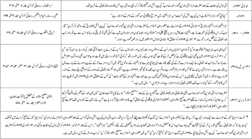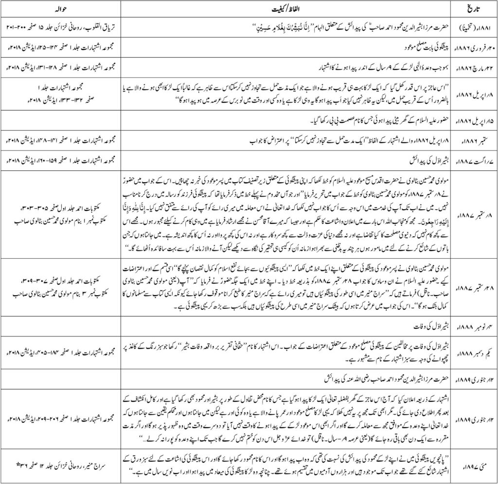 پیشگوئی مصلح موعود کے بارے میں حضرت مسیح موعود علیہ السلام نے نہ صرف اپنی کتب بلکہ اشتہارات، مکتوبات اور ملفوظات میں بھی ذکر فرمایا ہے۔ مصلح موعود کے متعلق یہ ذکر آپ کی کتابوں اور دیگر کتب میں دیکھا جاسکتا ہے۔ تاہم اس گوشوارہ کے بنانے کا مقصد تمام تواریخ، واقعات و اذکار کو جمع کرنا نہیں ہے بلکہ پیشگوئی مصلح موعود سے متعلق صرف اہم تواریخ و واقعات کو قارئین کی خدمت میں پیش کرنا مقصود ہے۔ اہم واقعات اور الہاما ت کا اشارۃً ذکر کیا گیا ہے۔ مکمل آگاہی کے ليے قارئین سے درخواست ہے کہ ديے گئے حوالوں کو ان کی اصل کتاب سے ضرور پڑھیں تاکہ مکمل مضمون ذہن میں اُتر سکے۔
