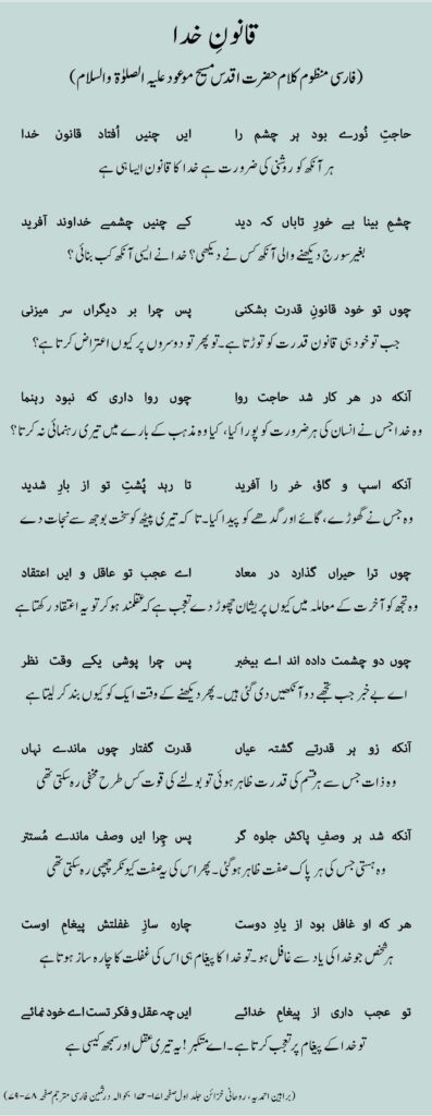 (براہین احمدیہ، روحانی خزائن جلد اول صفحہ۱۷۱-۱۷۲ بحوالہ درثمین فارسی مترجم صفحہ ۷۸-۷۹)
