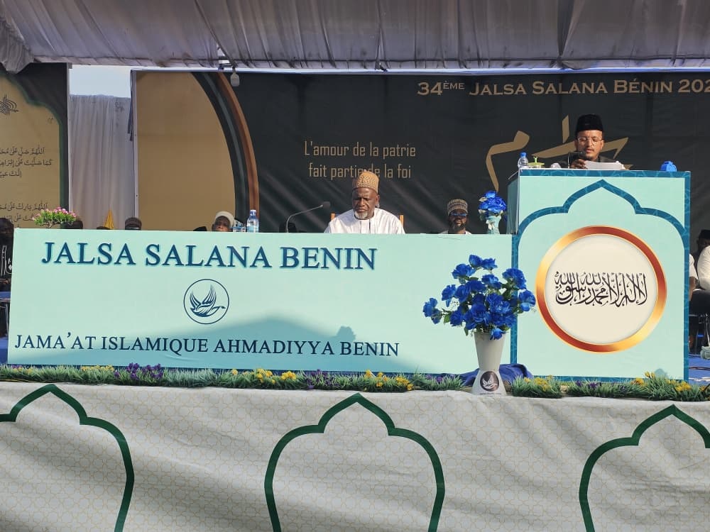 محض اللہ تعالیٰ کے فضل سے امسال حضور انور ایدہ اللہ تعالیٰ بنصرہ العزیز نے جماعت احمدیہ بینن کے جلسہ سالانہ کے لیے خصوصی پیغام ارسال فرمایا جو کہ مکرم امیر صاحب بینن نے پڑھ کر سنایا جس کا فرنچ ترجمہ مکرم پوکولا قاسم صاحب افسر جلسہ سالانہ نے پیش کیا۔ اس کے بعد امیر صاحب نے جلسہ کے مرکزی موضوع پر فرانسیسی زبان میں تقریر کی جس میں قرآن کریم کی تعلیمات اور آنحضورﷺ کے نمونہ کو قیام امن کے ليے احسن رنگ میں پیش کیا۔ اس تقریر کا مقامی زبانوں میں بھی ترجمہ کیا گیا۔ اس کے بعد نماز مغرب و عشاء ادا کی گئیں۔