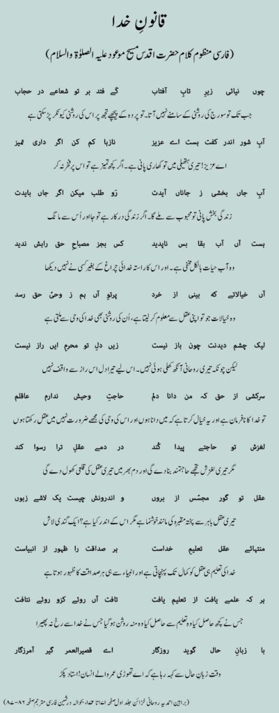 (براہین احمدیہ روحانی خزائن جلد اول صفحہ ۱۷۱تا ۱۷۲، بحوالہ درثمین فارسی مترجم صفحہ ۸۶-۸۷)