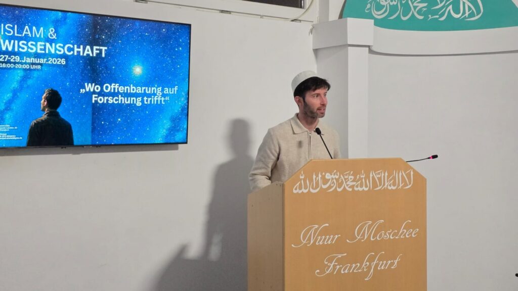 محض اللہ تعالیٰ کے فضل سے مسجد نور، فرانکفورٹ جرمنی میں لوکل امارت جماعت احمدیہ فرانکفورٹ کو مورخہ ۲۷؍جنوری تا ۴؍فروری ۲۰۲۶ء ’اسلام اور سائنس‘ کے موضوع پر خصوصی نمائش لگانے کی توفیق ملی۔ اس نمائش کو مکرم عدیل احمد خالد صاحب مبلغ سلسلہ شعبہ تبلیغ و مکرم ڈاکٹر اسامہ احمد صاحب جوکہ نیوکلیئر فزکس کی تعلیم حاصل کررہے ہیں، نے اپنی ٹیم کے ساتھ مل کر بڑی محنت سے قرآنی استدلال کے ساتھ تصویری رنگ میں تیار کیا۔ یہ نمائش ابتدائی طور پر ۲۵؍پوسٹرز پر مشتمل تھی جن میں ان مضامین پر روشنی ڈالی گئی: جیو سینٹرک نظریہ، زمین چپٹی نہیں، اسلام– ایک متحرک تبدیلی، ہیلیو سینٹرک نظریہ، کائناتی جال، ایک حیرت انگیز پیشگوئی، قرآن میں بگ بینگ، کامل ڈیزائن، کائنات کے چھ ادوار، کائنات کا انجام، لوہے کا عددی کمال، ابجدی عددی نظام، زندگی پانی سے، سمندری ہائیڈروتھرمل میدان، ابتدائی کیمیائی سوپ، ملر–یوری تجربہ نیز کیا سب کچھ اتفاق ہے؟۔ اسی طرح درج ذیل مسلم سائنسدانوں کے انسانی معاشرےاور جدید سائنسی ایجادات پر احسانات کا بھی ذکر تھا:نصیرالدین طوسیؒ، ابن سیناؒ، ابن رشدؒ، ابن فرناسؒ، البیرونی، جابر بن حیان، ابن الہیثم اور الخوارزمی۔