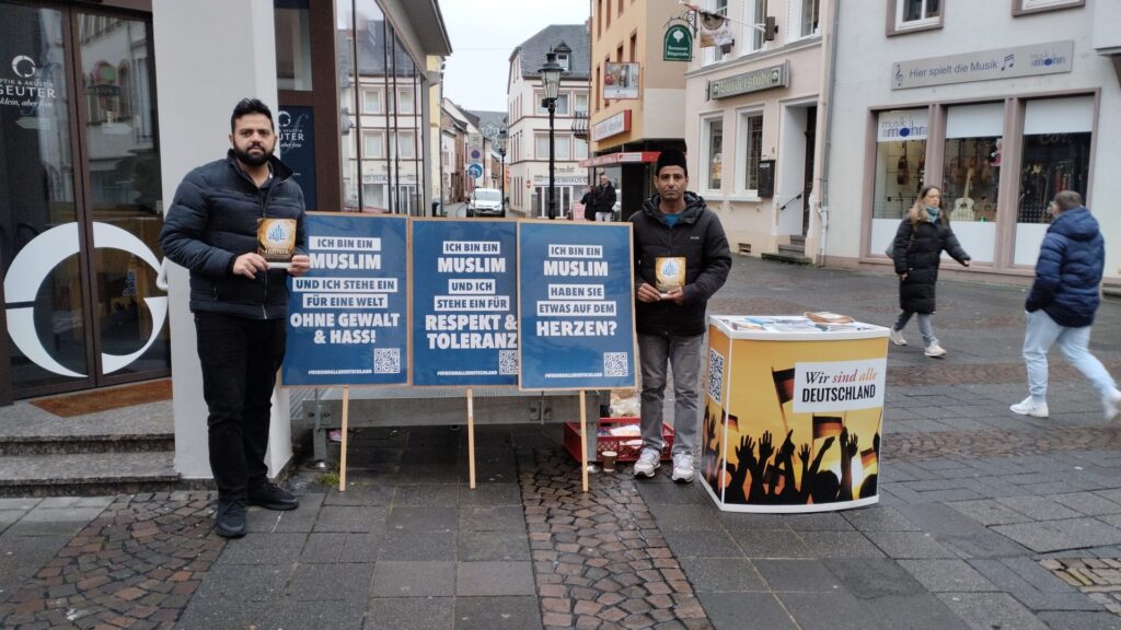 ۳؍جنوری کو مجلس Wiesbaden Mitteمیں شہر کی مین مارکیٹ کے ایریا میں انصار بھائی جماعت کے پُرامن پیغامات کے پوسٹر لے کر کھڑے ہوئے اور تبلیغ سٹینڈ لگایا گیا جس دوران تبلیغی فلائرز اور لٹریچر تقسیم کيے گئے اور دلچسپی لینے والے احباب سے بات چیت کر کے ان کے سوالوں کے جواب بھی دیے گئے۔ الحمدللہ