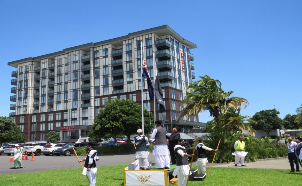 تقریب پرچم کشائی:دوپہر سوا دو بجے تقریب پرچم کشائی منعقد ہوئی۔ مکرم مبلغ انچارج صاحب نے لوائے احمدیت لہرایا جبکہ نیوزی لینڈ کا قومی پرچم مکرم صدر صاحب نے لہرایا۔ فضا نعرہ تکبیر سے گونج اٹھی۔ بعدہٗ صدر صاحب نے اجتماعی دعا کرائی۔
