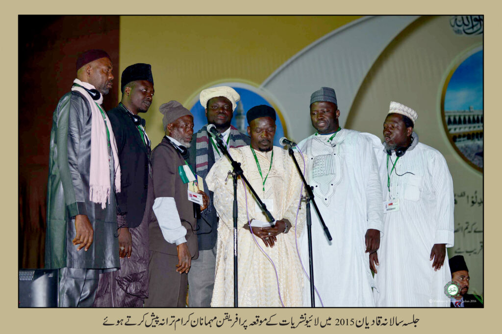 دعا کے بعد قادیان کے سٹیج سے مختلف گروپس نے مختلف زبانوں میں ترانے پیش کئے جن میں عربی اور اردو کے علاوہ ملیالم،اُڑیہ، کشمیری زبان میں ترانے پیش ہوئے اور افریقی گروپ نے بھی اپنی زبان میں ترانہ پیش کیا نیز اپنے روایتی انداز میں لاالہ الا اللہ کا ورد کیاجسے سامعین نے بھی ان کے ساتھ دہرایا۔اطفال کے بھی ایک گروپ نے ترانہ پیش کیا۔اس کے بعد لجنہ کے سٹیج سے بھی ترانے پیش کئے گئے۔اس تمام کارروائی کے دوران حضور پرنور سٹیج پر رونق افروزرہے۔پھر حضور انور السلام علیکم ورحمۃ اللہ کاتحفہ پیش کرتے ہوئے تشریف لے گئے۔
