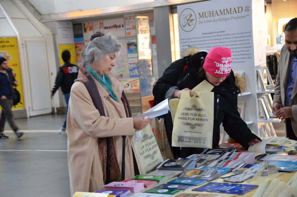 مختصراً یہ کہ اس ریلوے اسٹیشن پر روزانہ تقریبًا 4لاکھ مسافروں کا آنا جانا ہوتا ہے۔ اللہ کے فضل سے احباب جماعت نے یہاں 48گھنٹے مسلسل ڈیوٹیاں دیں اور جرمن، ترکی ،عربی، فارسی ،البانین،پشتو اور اردو کے علاوہ دیگر کئی زبانوں میں لوگوں کے سوالات کے جواب دیئے گئے۔اس نمائش کی خبر(جدید الیکٹرانک میڈیا کے ذریعہ) پورے جرمنی کے احمدیوں تک پہنچی اور تبلیغ کا شوق اور خدمت دین کا جذبہ رکھنے والے اپنے آپ کو روک نہ پائے اور اس موقع کو غنیمت جانتے ہوئے از خوداس نمائش میں مدد اور ڈیوٹی دینے کے لئے دیوانہ وار آتے رہے۔ گو کہ یہ چھٹی والے دن نہیں تھے پھر بھی اللہ کے فضل سے اس نمائش کو انتہائی منظم طریق پر لگانے کی توفیق ملی۔اس نمائش کو اللہ کے فضل سے 40ہزار سے زائد لوگوں نے وزٹ کیا اوراس کے نتیجہ میں جرمن زبان میں کل30موضوعات پر 28019عدد لٹریچر حاصل کیا۔ اسی طرح آنحضرت صلی اللہ علیہ وسلم کی سیرت پر مشتمل کتاب کو لوگوں نے ہاتھوں ہاتھ لیا۔نیز حضورِانور ایدہ اللہ تعالیٰ کے مختلف خطابات پر مشتمل کتاب عالمی بحران اور امن کا راستہ بھی لوگوں نے حاصل کیں ۔اس کے علاوہ 12موضوعات پر عربی ، ترکی،انگلش، البانین اور فارسی میں لٹریچر وزیٹرز کو دینے کی توفیق ملی۔ اللہ کے فضل سے مجموعی طور پر48 گھنٹوں میں کل 31135عدد لٹریچر تقسیم ہوا۔
