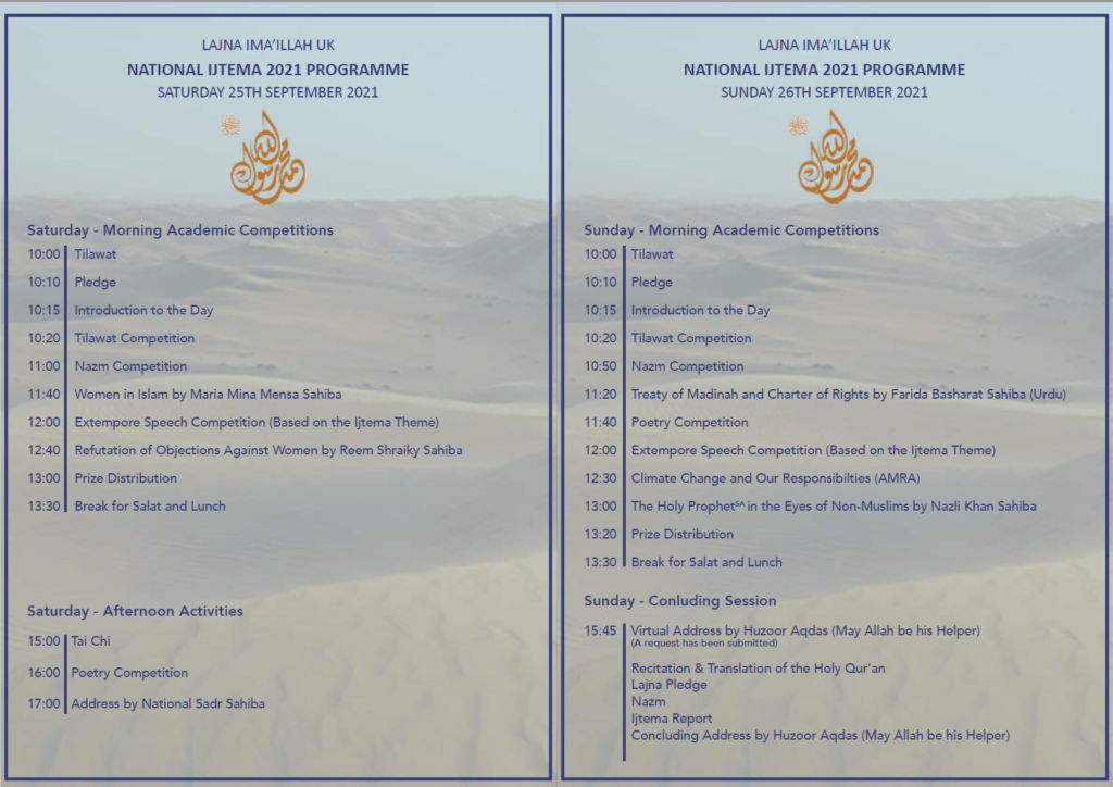 اللہ تعالیٰ کے فضل و کرم سے لجنہ اماء اللہ برطانیہ کا نیشنل اجتماع مورخہ 25 و 26؍ستمبر 2021ء کو بیت الفتوح، مورڈن میں وبائی حالات کے باعث دو سال کے وقفہ کے بعد نہایت کامیابی کے ساتھ منعقد ہوا۔