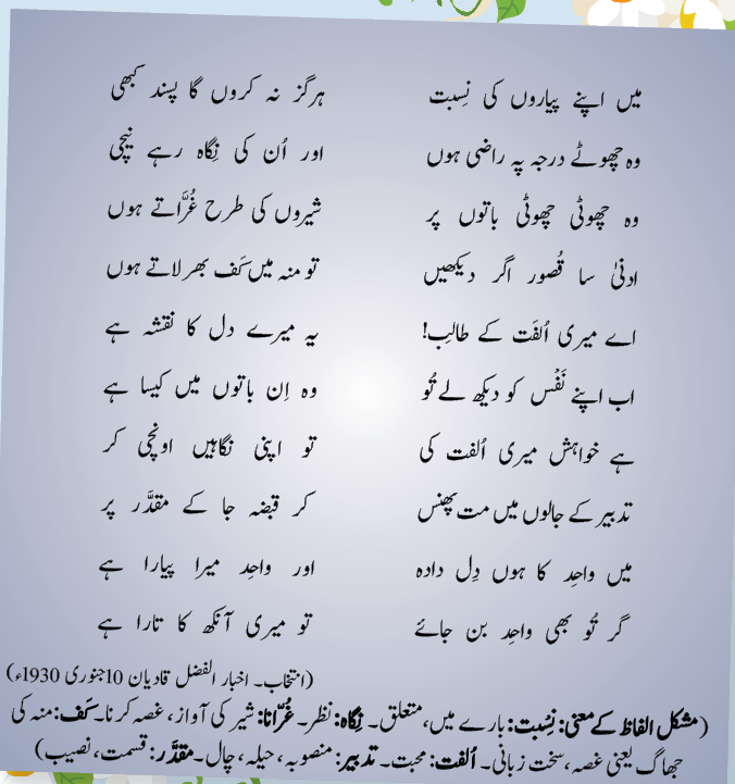 (مشکل الفاظ کے معنی: نِسْبت: بارے میں، متعلق۔ نِگاہ: نظر۔ غُرّانا: شیر کی آواز، غصہ کرنا۔ کَف:منہ کی جھاگ یعنی غصہ، سخت زبانی۔ اُلفت: محبت۔ تدبیر: منصوبہ، حیلہ، چال۔ مقدَّر: قسمت، نصیب)