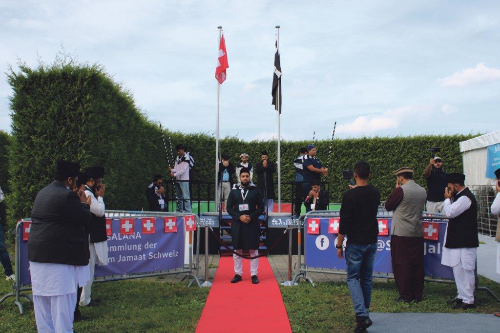 سہ پہر چار بج کر پچیس منٹ پر پرچم کشائی کی تقریب منعقد ہوئی جس میں لوائے احمدیت منیر احمد منور صاحب مبلغ انچارج سوئٹزرلینڈ جبکہ سوئٹزرلینڈ کا پرچم مکرم ولید طارق تارنتسر صاحب نیشنل امیر جماعت ہائے احمدیہ سوئٹزرلینڈ نے لہرایا اور دعا کروائی۔