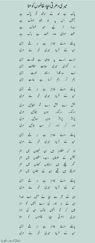 پاک ہے حمد کے ساتھ تُو پاک ہےرحمتیں اس پہ جو شاہِ لولاک ہےدیدۂ تر لیے عبدِ غمناک ہےسخت موذی عدو سخت بے باک ہے پالنے والے خادم ہے ہر شے تریسن کے فریاد میری خبر لے مری ذرے ذرے پہ حاوی ہے قدرت تریہر گھڑی میری حاجت حفاظت تریاے مددگار! درکار نصرت تریرحم کر رحم کرنا ہے عادت تری پالنے والے خادم ہے ہر شے تریسن کے فریاد میری خبر لے مری بخش دے بخش دے تُو خطائیں مریدرگذر درگذر ہوں جفائیں مریپُراثر پُراثر ہوں دعائیں مریدُور کر دُور کر سب بلائیں مری پالنے والے خادم ہے ہر شے تریسن کے فریاد میری خبر لے مری جو کہ مظلوم ہیں ان مکینوں میں ہمپھنس کے طوفاں رسیدہ سفینوں میں ہمگھر چکے ہیں رذیلوں کمینوں میں ہمڈالتے ہیں تجھے ان کے سینوں میں ہم پالنے والے خادم ہے ہر شے تریسن کے فریاد میری خبر لے مری ان کے شر سے بچا لے ہمیں اے خدا!ان کے ہر جور کی دے انہیں تُو سزاپیس کر تو انہیں خاک ان کی اڑامیری دھرتی بچا، ظالموں کو مٹا پالنے والے خادم ہے ہر شے تریسن کے فریاد میری خبر لے مری (طارق محمود طاہر۔ نائیجیریا) مزید پڑھیں: دیے لہو کے جلاتے چلے گئے عشّاق