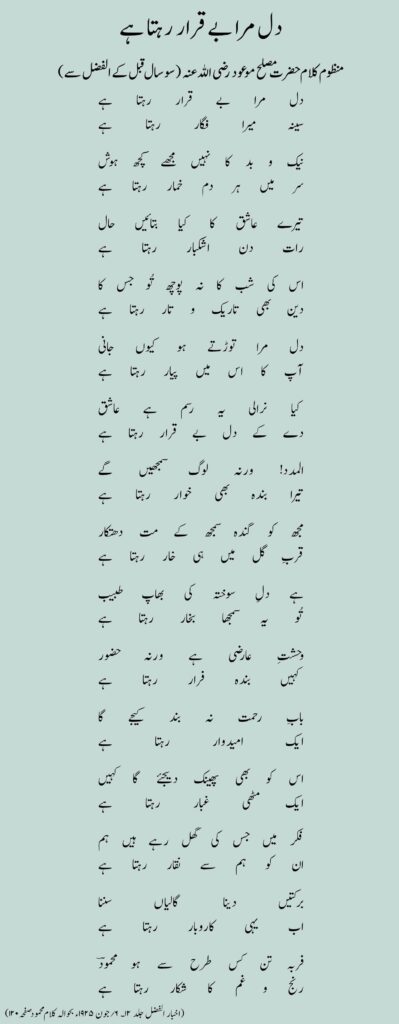 (اخبار الفضل جلد ۱۲۔ ۶؍جون ۱۹۲۵ء بحوالہ کلام محمود صفحہ۱۲۰)