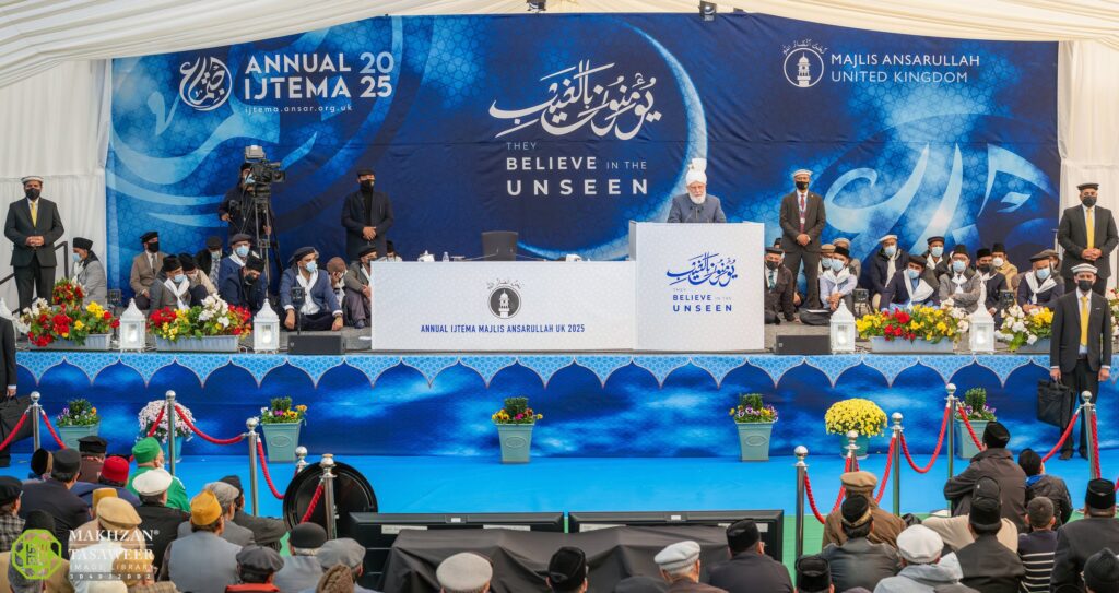 (۲۸؍ستمبر ۲۰۲۵ء، نمائندگان الفضل انٹرنیشنل) اميرالمومنين حضرت خليفةالمسيح الخامس ايدہ اللہ تعالیٰ بنصرہ العزيز نے مورخہ ۲۸؍ستمبر ۲۰۲۵ء بروز اتوار مجلس انصاراللہ برطانیہ کے سالانہ اجتماع (منعقدہ ۲۶تا۲۸؍ستمبر ۲۰۲۵ء) سے بصیرت افروز اختتامی خطاب ارشاد فرمایا۔ یہ خطاب ایم ٹی اے کے مواصلاتی رابطوں کے توسّط سے پوری دنیا میں براہ راست دیکھا اور سنا گیا۔ امسال مجلس انصاراللہ کا اجتماع گلفورڈ میں واقع Hook Lane پر موجود پچاس ایکڑ زمین پر منعقد ہوا جس کا مرکزی موضوع ’’یُؤۡمِنُوۡنَ بِالۡغَیۡبِ‘‘ تھا۔