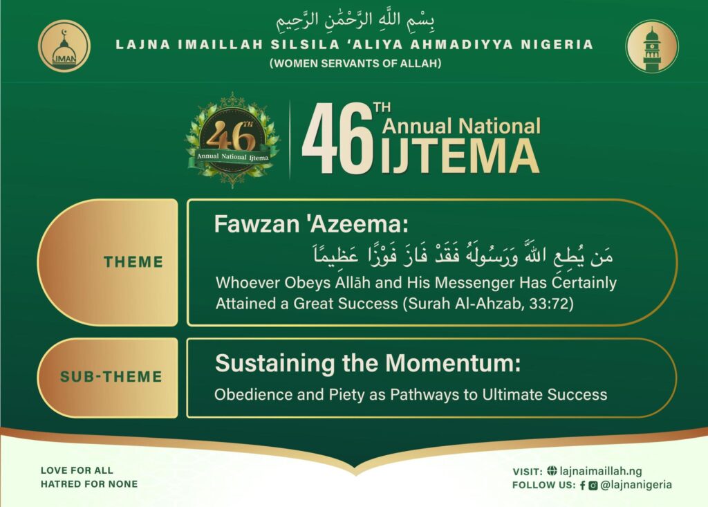 اللہ تعالیٰ کے خاص فضل سے لجنہ اماءاللہ نائیجیریا کو اپنا ۴۶واں سالانہ نیشنل اجتماع ۲۹تا ۳۱؍اگست ۲۰۲۵ء کو وکٹری کالج، ایکارے آکوكو، ریاست اونڈو (Victory College, Ikare, Akoko, Ondo)میں ‘وَمَنۡ یُّطِعِ اللّٰہَ وَرَسُوۡلَہٗ فَقَدۡ فَازَ فَوۡزًا عَظِیۡمًا’’ یعنی اور جو بھی اللہ اور اس کے رسول کی اطاعت کرے تو یقیناً اُس نے ایک بڑی کامیابی کو پالیا (الاحزاب:۷۲) کے مرکزی موضوع پر کامیابی کے ساتھ منعقد کرنے کی توفیق ملی۔ الحمدللہ