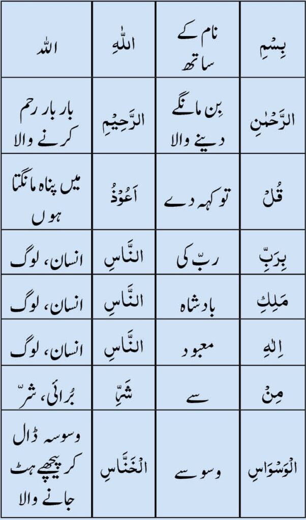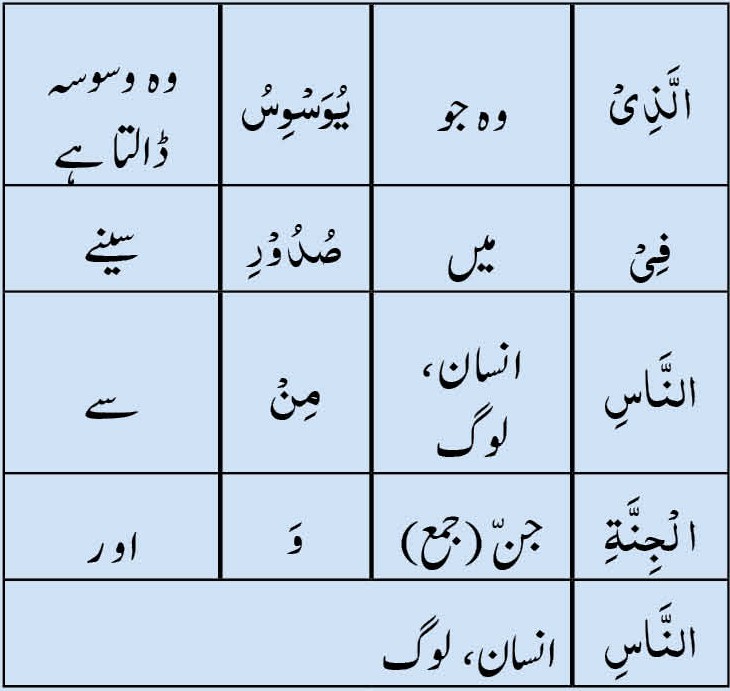تُو کہہ دے کہ میں انسانوں کے ربّ کی پناہ مانگتا ہوں۔ انسانوں کے بادشاہ کی۔ انسانوں کے معبود کی۔ بکثرت وسوسے پیدا کرنے والے کے شرّ سے، جو وسوسہ ڈال کر پیچھے ہٹ جاتا ہے۔ وہ جو انسانوں کے دلوں میں وسوسے ڈالتا ہے۔ (خواہ) وہ جنوں میں سے ہو (یعنی بڑے لوگوں میں سے) یا عوام الناس میں سے۔