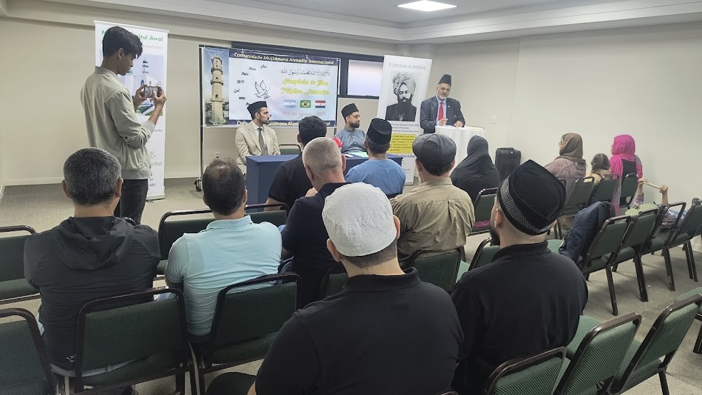 برازیل کا ایک اہم شہر Foz do Iguaçu صوبہ Paraná میں پاراگوائی اور ارجنٹائن کی سرحدوں پر واقع ہے۔ اِس اہمیت کے پیش نظر خاکسار (مبلغ انچارج جماعت احمدیہ برازیل) نے پاراگوائی اور ارجنٹائن کے مبلغین کرام سے مشورہ کے بعد حضور انور ایدہ اللہ تعالیٰ بنصرہ العزیز کی منظوری سے مورخہ ۱۸؍اکتوبر ۲۰۲۵ء بروز ہفتہ اس شہر میں ایک پیس سمپوزیم کے انعقاد کا پروگرام بنایا۔ خاکسار اس پروگرام میں شرکت اور تیاری وغیرہ کے ضمن میں مکرم اعجاز احمد ظفر صاحب صدر مجلس خدام الاحمدیہ برازیل کے ہمراہ ۱۴؍اکتوبر کو اس شہر میں پہنچا جو ہمارے مشن ہاؤس سے تقریباً ۱۵۰۰؍کلومیٹر کے فاصلے پر ہے۔ خاکسار نے مختلف اخبارات کو انٹرویوز دیے۔ چنانچہ بعض اخباروں نے نمایاں طور پر یہ انٹرویوز، جماعت احمدیہ کا تفصیلی تعارف نیز پیس سمپوزیم کے حوالے سے خبریں شائع کیں۔ ایک ٹیلی ویژن اور ریڈیو چینل Massa کے لائیو پروگرام میں خاکسار کا انٹرویو نشر ہوا۔ اسی طرح دوسرے قریبی شہروں کی دو اخباروںFolha de Londrina اور Jornal do Povo میں بھی کوریج ہوئی۔ سب نے تینوں ممالک کی شراکت کے پروگرام کو سراہا۔ علاوہ ازیں انفرادی طور پر بھی مختلف روابط کيے گئے اور سمپوزیم کے انعقاد کے بارے میں ایک اشتہار تیار کر کےاسلام اور احمدیت کے بنیادی تعارف پر مبنی پمفلٹس کے ساتھ اٹیچ کر کے ایک ہزار سے زائد کی تعداد میں شہر کے مختلف حصوں میں تقسیم کیا۔