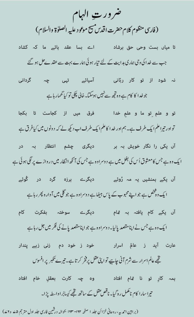 (براہین احمدیہ، روحانی خزائن جلد ۱ صفحہ ۱۶۲-۱۶۳ بحوالہ درثمین فارسی جلد اول مترجم ۷۵ و۷۶)