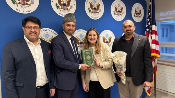 الله تعالیٰ کے فضل سے مورخہ ۲۱؍جنوری ۲۰۲۶ء کو فن لینڈ کے دارالحکومت ہیلسنکی میں امریکی سفارت خانے میں جماعت احمدیہ فن لینڈ کے ایک وفد نے پولیٹیکل و اکنامک آفیسر Ms. Kat Pack صاحبہ سے ملاقات کی۔ وفد میں نیشنل صدر جماعت احمدیہ فن لینڈ مکرم عطاء الغالب صاحب، مبلغ انچارج مکرم شاہد محمود کاہلوں صاحب اور نیشنل سیکرٹری امور خارجہ مکرم احمد فاروق قریشی صاحب شامل تھے۔