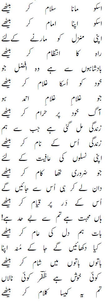 اسکو مانا سلام کر بیٹھے اسکو اپنا امام کر بیٹھے اپنی منزل کو مارنے کےلئے راہ کا انتظام کر بیٹھے بادشاہوں سے ہے وہ افضل جو خود کو اُسکا غلام کر بیٹھے جو غلامِ غلامِ احمد ہو آگ خود پر حرام کر بیٹھے زندگی مل گئی ہے جب سے ہم زندگی اُس کے نام کر بیٹھے اپنی نسلوں کی عافیت کے لئے جو ضروری تھا کام کر بیٹھے دان لے کر ہی اُس سے جائیں گے اُس کے دَر پر قیام کر بیٹھے ہاں محبت ہے تم سے بے حد ہے! بات ہم دل کی عام کر بیٹھے کیا دکھائیں گے جا کے مُنہ اپنا باتوں باتوں میں شام کر بیٹھے کوئی خوش ہے ظفرؔ کوئی نالاں تم یہ کیسا کلام کر بیٹھے