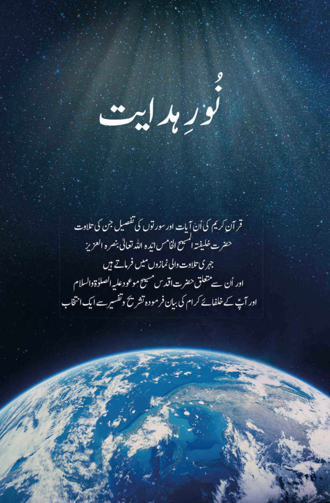 تعداد صفحات:1200 شائع کردہ: اسلام انٹرنیشنل پبلیکیشنز 18؍ مئی 1996ء کو ہیمبرگ(جرمنی) میں واقفینِ نَو بچوں اور بچیوں کی ایک کلاس حضرت خلیفۃ المسیح الرابع رحمہ اللہ کے ساتھ منعقد ہوئی۔ اس کلاس کے دوران حضور رحمہ اللہ نے ان سے پوچھا کہ اذان کے بعد کی دعا کس کو آتی ہے تو سوائے ایک آدھ کے کسی کو بھی یہ دعا یاد نہیں تھی اور اس کا ترجمہ بھی کسی کو نہیں آتا تھا۔ حضور رحمہ اللہ نے اچھی طرح سمجھا کر اذان کے بعد کی دعا اور اس کا ترجمہ سکھایا اور تاکید فرمائی کہ آپ نظمیں یا دعائیں جو کچھ بھی یاد کریں اس کے ترجمہ و مفہوم کو بھی اچھی طرح یاد کریں۔ اسی تسلسل میں آپؒ نے یہ بھی فرمایا کہ ‘‘بچوں کو خصوصیت سے اور بڑوں کو بھی وہ آیتیں یاد کرنی چاہئیں جن کی نمازوں میں تلاوت کرتا ہوں اور اکثر مَیں فجر، مغرب اور عشاء کی نمازوں میں بدل بدل کر تلاوت کرتا ہوں۔’’ حضور رحمہ اللہ نے فرمایا کہ ‘‘یہ آیتیں جو مَیں نے چُنی ہیں کسی مقصد کے لئے چُنی ہیں۔ اگر ان کا ترجمہ آتا ہو تو اس کا دل پر اثر پڑے گا۔ اگر مطلب نہ آتا ہو تو اس کا کوئی فائدہ نہیں۔’’ اسی طرح حضور رحمہ اللہ نے تاکیدی ہدایت فرمائی کہ ‘‘جو سورت تلاوت کریں اس کا ترجمہ ضرور آنا چاہیے۔ ترجمہ کو غور سے پڑھیں اور یاد کریں اور اتنا یاد کریں کہ اِدھر تلاوت ہو رہی ہو اور اُدھر آپ کے دل میں اس کا مضمون اتر رہا ہو حتیٰ کہ آپ کا دل قرآن کی عظمت سے بھر جائے۔’’ (الفضل انٹرنیشنل 7 تا 13 جون 1996ء صفحہ 9) اپریل1997ءمیں لجنہ اماء اللہ مقامی ربوہ نے حضور رحمہ اللہ کی نمازوں میں تلاوت فرمودہ آیات کو یکجا کر کے مع ترجمہ شائع کیا۔ 2015ء کے آخر پر انہوں نے اس کا دوسرا ایڈیشن تیار کیا جس کے آغاز میں ایک تحقیقی اور معلوماتی نوٹ بھی شامل کیا گیا جس میں اُن آیات و سُوَرِ قرآنی کی تفصیل درج کی گئی جو آنحضرت صلی اللہ علیہ وسلم اور حضرت اقدس مسیح موعود علیہ الصلوٰۃ والسلام اور حضرت خلیفۃ المسیح الاوّل رضی اللہ عنہ، حضرت خلیفۃ المسیح الثانی رضی اللہ عنہ، حضرت خلیفۃ المسیح الثالث رحمہ اللہ اور حضرت خلیفۃ المسیح الرابع رحمہ اللہ جہری تلاوت والی نمازوں میں تلاوت فرماتے تھے۔ اسی طرح جو آیات و سُوَر حضرت خلیفۃ المسیح الخامس ایدہ اللہ تعالیٰ بنصرہ العزیز نمازوں میں تلاوت فرماتے ہیں ان کی تفصیل بھی درج کی گئی ۔ حضورِ انو رایدہ اللہ تعالیٰ بنصرہ العزیز کی اجازت سے یہ تحقیقی نوٹ اس کتاب میں بھی شامل ہے۔ اس کے علاوہ امیر المومنین حضرت خلیفۃ المسیح الخامس ایدہ اللہ تعالیٰ بنصرہ العزیز کی ہدایت پر وہ تمام آیات و سُوَرِ قرآنی جن کی حضورِ انور ایدہ اللہ جہری تلاوت والی نمازوں (یعنی فجر، مغرب، عشاء اور جمعہ) میں تلاوت فرماتے ہیں ان کا عربی متن مع ترجمہ اور اسی طرح ان کی مختصر تشریح و تفسیر کو شامل کیا گیا ہے تا کہ افرادِ جماعت جب ان آیات و سُوَر کی تلاوت کریں یا سنیں تو ان کے مضامین بھی ان کے پیشِ نظر رہیں اور ان کے دل قرآن کی عظمت سے بھر جائیں۔ اس زمانہ میں اللہ تعالیٰ نے آنحضرت صلی اللہ علیہ وسلم کے ظلّ کامل اور آپؐ کے عظیم روحانی فرزند حضرت اقدس مسیح موعود و مہدی معہود علیہ الصلوٰۃ والسلام کو اس لئے مبعوث فرمایا کہ تا تعلیماتِ حقّہ قرآنی کو ہر قوم اور ہر ملک میں شائع اور رائج فرماوے۔ حضور ؑ فرماتے ہیں: ‘‘خداوند تعالیٰ نے اس احقر العباد کو اس زمانہ میں پیدا کر کے اور صدہا نشانِ آسمانی اور خوارق غیبی اور معارف و حقائق مرحمت فرما کر اور صدہا دلائل عقلیہ قطعیہ پر علم بخش کر یہ ارادہ فرمایا ہے کہ تا تعلیماتِ حقّہ قرآنی کو ہر قوم اور ہر ملک میں شائع اور رائج فرماوے اور اپنی حجت ان پر پوری کرے۔’’ (براہینِ احمدیہ۔ روحانی خزائن جلد اوّل صفحہ596حاشیہ در حاشیہ نمبر 3) اسی طرح آپؑ نے فرمایا: ‘‘جاننا چاہئے کہ کھلا کھلا اعجاز قرآنِ شریف کا جو ہر ایک قوم اور ہر ایک اہلِ زبان پر روشن ہو سکتا ہے جس کو پیش کر کے ہم ہر ایک ملک کے آدمی کو خواہ ہندی ہو یا پارسی یا یوروپین یا امریکن یا کسی اور ملک کا ہو ملزم و ساکت و لاجواب کر سکتے ہیں، وہ غیرمحد
