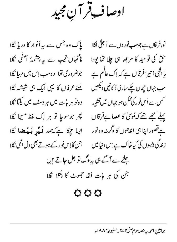 حضرت اقدس مسیح موعودؑ کا ساراکلام نظم و نثر آفاقی ہے۔ ہر زمانے اور خطّے کےلیے آپؑ کےفرمودات زندگی بخش پیغام لیے ہوئے ہیں۔ حضورؑ کے اردومنظوم کلام کا یہ مطالعہ ،ان نظموں پر غور کرنے کی ایک کوشش ہے۔ درِّثمین میں شامل پانچویں نظم ‘‘اوصافِ قرآنِ مجید’’ سیّدناحضرت اقدس مسیح موعودؑکی تصنیفِ لطیف‘‘براہینِ احمدیہ’’حصّہ سوم، مطبوعہ 1882ءسے ماخوذ ہے۔نو اشعار کی یہ مختصر نظم بحر رمل مثمن سالم میں ہے:مخبون محذوف۔ حاشیہ در حاشیہ نمبر 2میں‘آؤ عیسائیو ادھر آؤ ’نظم کے بعد حضورؑ نےرسالہ ‘نور افشاں ’3 مارچ 1882ء میں شائع ہونے والے اعتراض کا مختصر جواب ارشاد فرمایا ہے۔حضورؑ براہینِ احمدیہ میں اس نوع کے اعتراضات کے تسلی بخش جوابات دے چکے تھے۔ لیکن اِن صاحب نے اپنے اعتراض میں آپؑ کو بھی مخاطب کیا تھا اس لیے اِن کے وہم کے ازالے کےلیے مختصر طور پرآپؑ نے اس بات کا دوبارہ جواب عطا فرمایا۔ اعتراض یہ تھا کہ کن امور کے بیان میں قرآن مجید انجیل پر فوقیت رکھتا ہے۔ یا انجیل کے بعد قرآن کی کیا ضرورت تھی۔ حضورؑ فرماتے ہیں: ‘‘جاننا چاہیے کہ انجیل کی تعلیم کو کامل خیال کرنا سراسر نقصانِ عقل اور کم فہمی ہے۔خود حضرت مسیح نے انجیل کی تعلیم کو مبرّا عن النقصان نہیں سمجھا جیسا کہ انہوں نےآپ فرمایاہےکہ میری اور بہت سی باتیں ہیں کہ میں تمہیں کہوں۔پرتماُن کی برداشت نہیں کرسکتے لیکن جب وہ یعنی روح الحق آویگا۔تو وہ تمہیںصداقت کا راستہ بتلاوےگا۔انجیل یوحنّاباب ۱۶۔آیت ۱۴،۱۳،۱۲۔اب فرمائیےکیا یہی انجیل ہےکہ جو تمام دینی صداقتوں پر حاوی ہےجس کے ہوتےہوئے قرآن شریف کی ضرورت نہیں۔’’ (براہینِ احمدیہ حصّہ سوم،روحانی خزائن جلد ۱،صفحہ 300) حضورؑ نے فرمایا کہ یہ ممکن نہیں کہ آپ مسیح کے پیرو کہلا کر اس چیزکو کامل قرار دیں جسے وہ آپ سے اٹھارہ سو بیاسی برس پہلے ناقص قرار دے چکے۔ آپؑ نے معرفتِ الہٰی کے حصول کےلیے انجیل اور قرآن کریم کے مقابلےکا چیلنج دیا۔قرآن کریم کے فضائل میں سے اُن دو اُمور کے مقابلے کی دعوت دی جو آپؑ براہینِ احمدیہ میں رقم فرما چکے تھے۔ یعنی یہ کہ قرآن کریم تمام الہٰی صداقتوں کا جامع ہے۔کوئی بھی محقق ایسا لطیف نکتہ دریافت نہیں کرسکتا جو قرآن مجید میں موجود نہ ہو۔دوسرا امرجس میں آپؑ نے مقابلے کی دعوت دی وہ یہ ہے کہ قرآن کریم کی یہ خصوصیت ہے کہ وہ صداقت کے طالب کامطلوبِ حقیقی سے نہ صرف تعلق قائم کروادیتا ہےبلکہ خداتعالیٰ کے قرب سے مشرف کرکےایسے الہامِ الہٰی کا وارث بناتا ہےکہ جس کی صداقت پیش گوئیوں کے پورا ہونے کے ذریعے ثابت ہوتی ہے۔ آپؑ نے فرمایا کہ یہی پیوند حیاتِ ابدی کی حقیقت ہے۔ ان امور کے بیان کے بعد آپؑ نے دوٹوک الفاظ میں واضح کردیا کہ انجیل ہو یاتوریت ، عیسائی ہوں یا یہودی کوئی بھی متذکرہ بالا امور میں قرآن کی تاثیرات کا مقابلہ نہیں کرسکتا۔ اس سے آگے فارسی نظم ‘از نورِ پاک قرآن صبح صفا دمیدہ’درج ہے۔ جس کے اختتام پر ‘دیگر’کی سرخی کے تحت یہ نظم ‘نورِ فرقاں ہے جو سب نوروں سے اجلیٰ نکلا’مرقوم ہے۔ یہ ایک مردّف نظم ہے۔ یہی ردیف (نکلا) غالبؔ کی غزل ‘شوق،ہر رنگ، رقیبِ سروساماں نکلا’میں بھی ہے۔ غالبؔ کی اسی غزل کا وہ خوبصورت شعر ہے: بوئے گُل، نالہ دل ،دُودِ چراغِ محفل جو تری بزم سے نکلا، سو پریشاں نکلا اس نظم کا ہر شعر قرآن کریم کے اوصاف کے بیان میں لاجواب ہے۔ بالخصوص توحید باری تعالیٰ کےدنیا سے کُوچ کرجانے کے لیے پودے کے مرجھانے کی علامت بڑی دل سوز اور درد انگیز ہے۔ پانی، جو نباتات کے لیے بھی زندگی کا پیام ہے اس کی دست یابی پر ‘چشمہ اصفیٰ’ کے الفاظ فرحت کا ان مول احساس پیدا کرتے ہیں۔حضورؑ نے اِن اشعار سے پیشتر فرمایا تھا کہ ‘‘جس قدر سورہ اخلاص کی ایک سطر میں مضمون توحید بھرا ہواہے۔ وہ تمام توریت بلکہ ساری بائیبل میں نہیں پایا جاتا۔ ’’ قرآن کریم کے مقابلے میں توریت اور انجیل کی معذوری کے متعلق فرمایا: پہلے سمجھے تھے کہ موسیٰ کا عصا ہے فرقاں پھر جو سوچا تو ہراک لفظ مسیحا نکلا قرآن کریم نے گذشتہ فرقوں کے تنازعات او