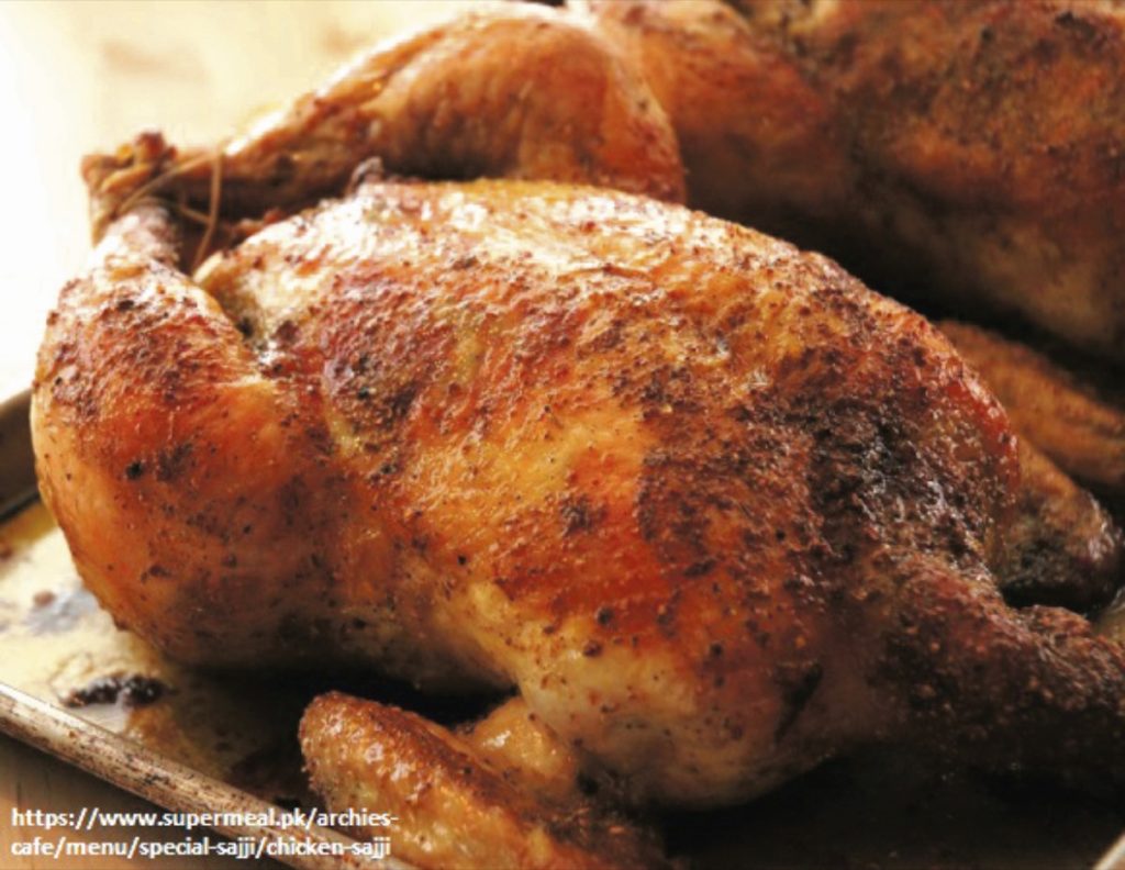 اجزاء چکن پورا مع سکن۔۔۔1کلوگرام کھانے کا تیل۔۔۔2کھانے کے چمچ ادرک ،لہسن کا پیسٹ ۔۔۔2،2کھانے کے چمچ لیموں کا رس ۔۔۔1کھانے کا چمچ نمک۔۔۔ 2 کھانے کے چمچ یا حسب ضرورت زیرہ پاؤڈر ۔۔۔2کھانے کے چمچ دھنیا پاؤڈر۔۔۔2کھانے کے چمچ کالی مرچ ۔۔۔2کھانے کے چمچ چاٹ مصالحہ ۔۔۔2کھانے کے چمچ کالا نمک ۔۔۔2کھانے کے چمچ ٹاٹری ۔۔۔2یا3چٹکی لونگ پسی ہوئی۔۔۔6عدد سجی مصالحہ اجزاء چاٹ مصالحہ ۔۔۔2کھانے کے چمچ نمک۔۔۔حسب ضرورت دھنیا پاؤڈر ۔۔۔1کھانے کا چمچ ترکیب چکن کو اچھی طرح سے دھو کر خشک کر لیں پھر ایک بیکنگ ٹرے یا ڈش میں سارے اجزاء کو مکس کر لیں اور پورے چکن کو اس مصالحے میں اچھی طرح سے میری نیٹ کر لیں اور تقریباً 8سے9گھنٹے کے لیے چھوڑ دیں۔ تاکہ مصالحہ اچھی طرح سے اندر تک چلا جائے۔جب 9گھنٹے گزر جائیں تو چکن کو ‘‘پری ہیٹڈ ’’اوون میں 80پر 40سے45منٹ تک یا جب تک چکن گل نہ جائے بیک کریں۔نارمل 45منٹ میں چکن بیک ہو جاتا ہے۔اب چکن کو نکال کر اُس کے اوپر سجی مصالحہ چھڑک دیں۔مزیدار چکن سجی تیار ہے۔ اب اس کوسلاد روٹی، نان یا چاول کے ساتھ سرو کریں۔