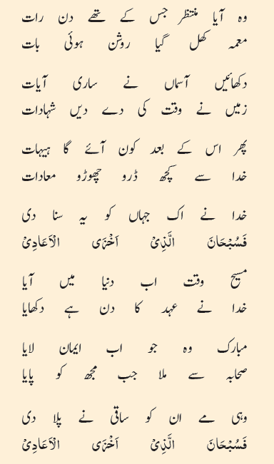 (ذیل کے اشعار جلسہ سالانہ جرمنی 2019ء کے موقع پر افتتاحی اجلاس میں پڑھے گئے) وہ آیا منتظر جس کے تھے دن رات معمہ کھل گیا روشن ہوئی بات دکھائیں آسماں نے ساری آیات زمیں نے وقت کی دے دیں شہادات پھر اس کے بعد کون آئے گا ہیہات خدا سے کچھ ڈرو چھوڑو معادات خدا نے اک جہاں کو یہ سنا دی فَسُبْحَانَ الَّذِیْ اَخْزَی الْاَعَادِیْ مسیح وقت اب دنیا میں آیا خدا نے عہد کا دن ہے دکھایا مبارک وہ جو اب ایمان لایا صحابہ سے ملا جب مجھ کو پایا وہی مے ان کو ساقی نے پلا دی فَسُبْحَانَ الَّذِیْ اَخْزَی الْاَعَادِیْ