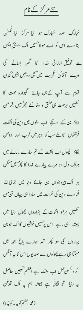 مُبارک صد مُبارک ہو نیا مرکز نیا گُلشن بنا دے اس کو اے مولا حسیں اک وادیِٔ ایمن مِلے توفیقِ ارزانی خدا کا گھر بسانے کی مِرے آقا کی قُربت میں سبھی روحیں بنیں کُندن قدم سے آپ کے بن جائے گہوارہ محبت کا کھلیں ہرسمت ہی عشق و وفا کے پھرحسیں خِرمن الاؤ بن کے دہکے اب دلوں میں دین کی اُلفت فرشتوں کا مِلے سب کو دہر میں قُرب اور دامن لگاؤ پُھول اب اُلفت کے تم سارے زمانے میں ہراک دل ہو مِرے پیارے خدا کا پھرحسیں مسکن ہر اک پیروجواں بن جائے دنیا میں جری اللہ لُٹا دے دین کی حُرمت میں سارا ہی یہاں تن من کھلیں ہر سُو اخوت کے ہزاروں پھول دنیا میں ہمیشہ ہی رہے اس پر حسیں خوشیوں کا اک جوبن بہاروں کی ہو پھر آمد ہمارے باغِ احمد میں مہکتا ہی رہےپھولوں سے صدیوں اس کا یہ آنگن کرو حُسنِ عمل اب وقت ہے اعظم تمہیں حاصل یہ دنیا تو لگاتی ہے ہمیشہ ہم پہ اک قدغن