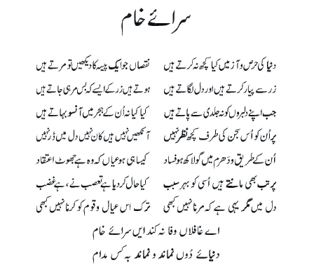 حضرت اقدس مسیح موعودؑ کا ساراکلام نظم و نثر آفاقی ہے۔ ہر زمانے اور خطّے کےلیے آپؑ کےفرمودات زندگی بخش پیغام لیے ہوئے ہیں۔ حضورؑ کے اردومنظوم کلام کا یہ مطالعہ ،ان نظموں پر غور کرنے کی ایک کوشش ہے۔ درِّثمین میں شامل ساتویں نظم ’’سرائے خام‘‘ سیّدنا حضرت اقدس مسیح موعودؑکی تصنیفِ لطیف‘سُرمہ چشم آریہ’ مطبوعہ 1886ءسے ماخوذ ہے۔آٹھ اشعار کی اس مختصر نظم کی بحر مضارع مثمن اخرب مکفوف محذوف ہے۔ حضورؑ نے ڈرائنگ ماسٹر لالہ مُرلی دھر سے ہونے والے مباحثہ اولیٰ کی روئیداد درج فرمانے کےبعد ،تتمّہ بعنوان ’’آریوں کا اُصولِ تناسخ قانونِ قدرت کے اُصول سے منافی ہے‘‘ تحریر فرمایا۔ جیسا کہ سُرخی سے ہی ظاہر ہے، آپؑ نےٹھوس دلائل کے ذریعے ہندوؤں کے اس غیر منطقی عقیدے کی خوب قلعی کھولی۔ یہ عقیدہ خداتعالیٰ کے مختارانہ کاموں اور تصرفات کا انکار کرتا ہے۔عقیدۂ تناسخ یعنی رُوح کا ایک قالب سے دوسرے قالب میں جانا اس بنیاد پر قائم ہے کہ کائناتِ عالم میں ترتیب و انتظام بالفعل موجود ہے۔ پرمیشر کے ارادے کا اس میں دخل نہیں بلکہ ان مختلف صورتوں اور اشیاء کی دست یابی گناہ گاروں کے گناہ کرنے پر موقوف ہے۔ اس امر کی وضاحت کرتے ہوئے آپؑ فرماتے ہیں: ’’مثلاً گائے جو دودھ دیتی ہے۔ یا گھوڑاجو سواری کےکام آتا ہےیاگدھاجوبوجھ اٹھاتا ہے۔یازمین جس پر ہم آباد ہیں۔ یاچانداورسورج جو دوچمکتے ہوئے چراغ اپنی مختلف قوتوں اور خاصیتوں سے انواع اقسام کے فوائد دنیا کو پہنچاتے ہیں یا گیہوں اور چنے اور چانول وغیرہ ماکولات جنکو ہم کھاتے ہیں یہ سب بقول آپ کے حقیقت میں انسانی رُوحیں ہیں جوکسی جنم گذشتہ کی شامت سے بطور تناسخ یہ صورتیں اختیار کرلی ہیں اور یہ سارا مجمع مختلف چیزوں کا جو زمین وآسمان میں نظر آتا ہے یہ سب حسبِ اصول آپ لوگوں کے اتفاقی ہے جس میں پرمیشر کےارادہ اور قدرت کا سرِمُو دخل نہیں‘‘ (سرمہ چشم آریہ،روحانی خزائن جلد2،صفحہ 134،133) تناسخ کے اس باطل عقیدے کے باعث نہ صرف خداتعالیٰ کی قدرتوں کا انکار کرنا پڑتا ہے بلکہ حلال وحرام کا فرق بھی مٹ جاتا ہے۔ یہ ایک ایسی خرابی ہے کہ کوئی بھی غیرت مند شخص اِس کی تاب نہیں لا سکتا۔ حضورؑ نےعقیدۂ تناسخ سے پیدا ہونے والی خرابی کی مثال بیان فرمائی؛ اِس مسئلے کی رُو سے عین ممکن ہے کہ کسی شخص کی والدہ، بہن یا بیٹی مرنے کے بعد کسی دوسری عورت کی جُون یا بھیس میں جنم لےاور پھر اُسی شخص کے نکاح میں آجائے،جس کی ماں یا بیٹی ہے۔ پس، ایسے باطل عقیدے پر ایمان رکھنے والے کو اِس سے پیدا ہونے والی خرابیوں کو بھی جائز سمجھنا ہوگا۔اب سوال یہ پیدا ہوتا ہے کہ اس قدر بے حیائی پر مبنی عقیدے کی آنکھوں دیکھی مکھی نگلنے کی آخر کیا وجہ ہے؟ حضورؑ اس کی وجہ دنیا پرستی اور قومی عصبیت کو قرار دیتے ہیں۔ فرماتے ہیں ’’قوم کا رعب اُن کے دلوں پر ایسا غالب ہے کہ جو مخلوق پرستی کی حد تک پہنچ گیا ہے خدائے تعالیٰ کا اُن کے دلوں میں اتنا بھی قدر نہیں جو ایک بوڑھی عورت کو اپنے گھر کی سُوئی کا ہوتا ہے‘‘ اس جگہ پہنچ کر یہ نظم آتی ہےاور مباحثہ اولیٰ اختتام پذیر ہوتا ہے۔ اس پس منظرکو مدِّنظر رکھنے کے بعد اندازہ ہوتا ہے کہ آپؑ نے گذشتہ صفحات میں جاری منطقی بحث کو اِن چند اشعار میں حُسن و خوبی کے ساتھ سُمو دیا ہے۔ انسان دنیا کی لالچ اور طمع میں ہرحد سے گزرنے کو تیار ہوجاتا ہے۔اپنا چھوٹا سا نقصان بھی برداشت نہیں کرتا۔ دنیاوی رشتوں اور عزیزوں کی خاطر خود کوہلکان کر لیتا ہے۔ لیکن دین کی رتّی برابر پرواہ نہیں کرتا۔ خدا کی رضا کبھی اُس کے پیشِ نظر نہیں ہوتی۔ اپنا عقیدہ اور مسلک جس قدر بھی بگاڑ کا باعث ہو اُس سے چپکا رہتا ہے۔ اس قدر خرابی کے باوجود ایسے جاہلانہ عقیدے پر قائم رہنے کی وجہ بیان کرتے ہوئے فرماتے ہیں: پر تب بھی مانتے ہیں اُسی کو بہر سبب کیا حال کردیا ہے تعصّب نے ہے غضب دل میں مگر یہی ہے کہ مرنا نہیں کبھی ترک اس عیال و قوم کو کرنا نہیں کبھی نظم کا آخری شعر فارسی زبان میں ہے جس کا ترجمہ لجنہ اماء اللہ ،کراچی کی شائع کردہ ‘درِّثمین مع فرہنگ’میں کچ