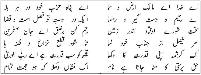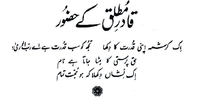حضرت اقدس مسیح موعودؑ کا ساراکلام نظم و نثر آفاقی ہے۔ ہر زمانے اور خطّے کےلیے آپؑ کےفرمودات زندگی بخش پیغام لیے ہوئے ہیں۔ حضورؑ کے اردومنظوم کلام کا یہ مطالعہ ،ان نظموں پر غور کرنے کی ایک کوشش ہے۔ درِّثمین میں شامل گیارہویں نظم‘‘قادرِمطلق کے حضور’’سیّدناحضرت اقدس مسیح موعودؑکی تصنیفِ لطیف ‘آسمانی فیصلہ’مطبوعہ 1892ءسے ماخوذ ہے۔دراصل یہ چھے اشعار کی ایک فارسی نظم ہے۔جس کا پہلا مصرعہ ‘اے خدا اے مالکِ ارض و سما’ ہے۔اس نظم کے ابتدائی چار اشعار فارسی زبان ،جبکہ آخری دو اشعار اردو زبان میں ہیں۔ درّثمین اردو میں بعنوان‘قادرِ مطلق کے حضور’یہی آخری دو اشعار شامل ہیں۔ یہ اشعار بحرِرمل مسدس محذوف میں ہیں۔ مولوی نذیرحسین دہلوی اور مولوی محمد حسین بٹالوی و دیگر علما کے حیات و وفاتِ مسیح کے موضوع پر بحث سے انکار کے بعد حضرت اقدس مسیح موعودؑ نے دسمبر 1891ء میں ایک رسالہ بعنوان ‘آسمانی فیصلہ’ رقم فرمایا۔اس کتاب میں آپؑ نےپہلی مرتبہ مکفّر علما کو روحانی مقابلے کا چیلنج دیا۔حضورؑ نے قرآن کریم کی روشنی میں مومنوں کو ملنے والی خاص علامات جیسے اظہار امورِ غیبیہ، قبولیتِ دعا اور انکشاف معارفِ قرآنیہ میں مقابلے کی دعوت دی۔ اس کتاب کے آغاز میں حضورؑ نے اُن تین اشتہاروں کا تذکرہ فرمایا کہ جو آپؑ نے دہلی میں شائع فرمائے۔ اِن اشتہاروں میں حضورؑنے بار بار اپنا مسلمان ہونا ظاہر فرمایا۔ اللہ جلّ شانہٗ کی قسم کھا کر اعلان کیا کہ آپ ؑ کی کسی تحریروتقریر میں کوئی ایسا امر نہیں کہ جو اسلام کے عقیدے کے مخالف ہو۔ لیکن اس سب کےباوجود مولوی نذیر حسین دہلوی صاحب نےتقویٰ اور دیانت کی راہ کو چھوڑکر، اپنے شاگردوں کےذریعے حضورؑ کے خلاف عوام الناس کو خوب بھڑکایا اور ایک سخت فتنہ برپا کردیا۔ حضورؑ نے اہلِ دہلی کی نسبت فرمایا کہ ‘‘شائد دہلی میں ساٹھ یا ستّر ہزار کے قریب مسلمان ہوگا لیکن ان میں سے واللہ اعلم شاذونادر کوئی ایسا فرد ہوگا جو اس عاجز کی نسبت گالیوں اور لعنتوں اور ٹھٹھوں کے کرنے یا سننے میں شریک نہ ہوا ہو۔یہ تمام ذخیرہ میاں صاحب(مولوی نذیر حسین دہلوی۔ناقل) کے ہی اعمال نامہ سے متعلق ہے’’۔ (آسمانی فیصلہ، روحانی خزائن جلد4، صفحہ 313-312) اس کے بعد حضورؑ نے اپنے عقائد کی ایک مرتبہ پھر وضاحت فرمائی ۔ دہلی میں قیام کے دوران مولوی نذیر حسین صاحب کےدعوتِ مباحثہ سےمسلسل فرار کی وجہ بیان فرمائی۔ مولوی نذیر حسین صاحب بے جا الزام اور افترا سے کام لیتے رہے اورمتنازعہ فیہ امر یعنی وفاتِ مسیح کے موضوع پر بحث کے لیےکسی طور آمادہ نہ ہوئے۔ اس جگہ حضورؑ نے ایک مرتبہ پھر مولوی نذیر حسین صاحب کو بحث کی دعوت دی۔ بحث کو فیصلہ کُن حیثیت دینے کے لیے آپؑ نے یہ مباحثہ پنجاب کے دارالحکومت لاہور میں منعقد کروانے کی تجویز دی۔ یہاں تک فرمایا کہ اگر مولوی صاحب بحث پر آمادہ ہوجائیں تو ان کے لاہور آنے جانے کا کرایہ میں خود ادا کروں گا۔ اس جگہ آپؑ نے اس بہتان کو شدّت کے ساتھ ردّ فرمایا کہ نعوذ باللہ حضورؑ مولوی نذیر حسین سے ڈر گئے اور بحث سے فرار اختیار کرتے رہے۔ آپؑ فرماتے ہیں: ‘‘میں ہرگز اُن سے نہیں ڈرا اور کیونکر ڈرتا مَیں اُس بصیرت کے مقابل پر جومجھے آسمان سےعطاکی گئی ہےاِن سفلی ملاؤں کوسراسر بےبصر سمجھتاہوںاوربخدا ایک مرے ہوئےکیڑےکےبرابربھی میں انھیں خیال نہیں کرتا۔کیا کوئی زندہ مُردوں سے ڈرا کرتا ہے۔یقیناً سمجھو کہ علمِ دین ایک آسمانی بھید ہے اور وُہی کماحقہ آسمانی بھید جانتا ہے جو آسمان سے فیض پاتاہے‘‘ (آسمانی فیصلہ، روحانی خزائن جلد 4، صفحہ 321-320) اس جگہ پہنچ کر یہ نظم درج ہے۔ نظم کے بعد حضرت اقدس مسیح موعودؑ نے قرآن کریم کی روشنی میں خداتعالیٰ کے چنیدہ اور برگزیدہ مومنوں کی علامات ظاہر فرمائیں۔ یعنی: اوّل: یہ کہ مومنِ کامل کو خداتعالیٰ سے بشارات ملتی ہیں۔ دوّم: یہ کہ مومنِ کامل پر اُمورِ غیبیہ کھولے جاتے ہیں۔ سوم: یہ کہ مومنِ کامل کی اکثردعائیں قبول کی جاتی ہیں۔ چہارم: یہ کہ مومنِ کامل پر قرآن کریم کے معارف سب سے زیادہ کھولے جاتے ہیں