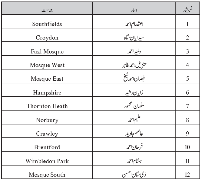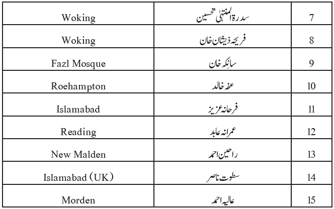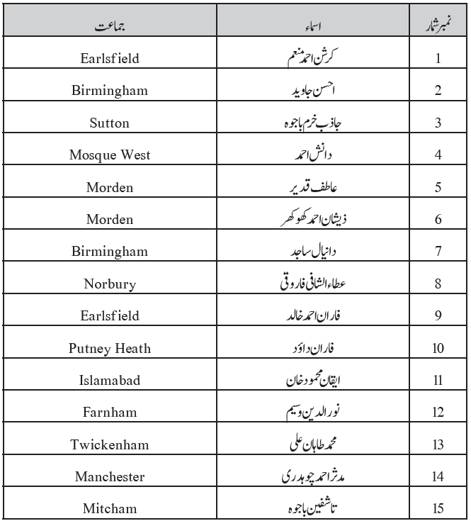 امیر المومنین حضرت خلیفۃ المسیح الخامس ایدہ اللہ تعالیٰ بنصرہ العزیز کی بابرکت موجودگی میں 57؍ خوش نصیب بچوں، بچیوں کی قرآنِ مجید ناظرہ کا پہلا دَور مکمل کرنے پر تقریبِ آمین کتنے خوش قسمت ہیں وہ احمدی بچے اور بچیاں جنہوں نے 31؍اگست اور یکم ستمبر 2019ء کو اسلام آباد (برطانیہ) کی بابرکت مسجد مبارک میں حضور انور ایدہ اللہ تعالیٰ بنصرہ العزیز کے قرب میں بیٹھ کر باری باری قرآن مجید کی ایک یا دو آیات یا آیت کا ایک حصہ پڑھ کر قرآن مجید کی قراءت کا پہلا دور مکمل کیا اور اس طرح اسلام آباد کی مسجد مبارک میں منعقد ہونے والی آمین کی پہلی اجتماعی تقریبات میں شرکت کی سعادت پائی۔ دونوں روز یہ تقاریب بعد نماز عصر منعقد ہوئیں۔ تقاریب کے آخر پر جملہ بچوں اور بچیوں اور ان کے والدین اور عزیز و اقارب نے حضور انور ایدہ اللہ تعالیٰ کے ساتھ اجتماعی دعا میں شرکت کی سعادت پائی۔ پہلے روز مختلف مقامات سے آئے ہوئے15 بچوں اور 15 بچیوں نے اور دوسرے روز 12 بچوں اور15 بچیوں نے ان تقاریب میں شمولیت کا غیر معمولی اعزاز پایا۔ ایسے بچوں اور بچیوں کی کل تعداد 57 تھی۔الحمد للہ کہ دونوں روز تقریباتِ آمین بطریق احسن منعقد ہوئیں۔ ان تقاریب میں شامل ہونے والے خوش قسمت بچوں اور بچیوں کے اسماء (ان کی جماعتوں کے اسماء کے ساتھ) حسب ذیل ہیں۔ اللہ تعالیٰ سب بچوں اور بچیوں کو اور ان کے والدین کو یہ اعزاز مبارک فرمائے اور قرآن مجید کے نور سے ان کے ذہنوں کو منور فرمائے۔آمین فہرست آمین۔ 31؍ اگست 2019ء (لڑکیاں) فہرست آمین۔ 31؍ اگست 2019ء (لڑکے) فہرست آمین۔ یکم ستمبر 2019ء (لڑکیاں) فہرست آمین۔ یکم ستمبر 2019ء (لڑکے)