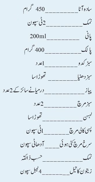 اجزا: تر کیب: آٹا میں نمک ڈال کر اس کو گو ندھ لیں اور 20منٹ کے لیے چھو ڑ دیں ۔ مصا لحہ بنانے کے لیے سب سے پہلے پا لک کو باریک کاٹ لیں اور کدو کو کش کر لیں ان دو نوں میں سبز دھنیا، پیاز،سبز مرچ،لہسن،کالی مرچ،کٹی سرخ مرچ ، نمک،زیتون کا تیل ڈا ل کر مِکس کر لیں ۔ گو ندھے ہو ئے آٹے کی با ریک با ریک رو ٹی بنا لیں۔پھر اس روٹی میں یہ مصا لحہ ڈا ل کر رو ٹی کو بند کر دیں با لکل ایسے جیسے آدھی رو ٹی کر تے ہیں ۔اب توے پر تیل ڈا ل کر ہلکی آنچ پر اسکو پکا ئیں ۔جب روٹی پک جا ئے تو اُتا ر لیں ۔مز ے دار ‘‘بو لانی مزا ری’’ تیا ر ہے۔