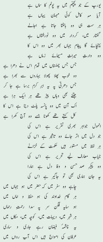 اس نظم کو بآواز سننے کے لیے یہاں کلک کیجیے: یورپ کے جو پچھم میں یہ پونم کا سماں ہے آیا مہِ کامل کوئی مہمان یہاں ہے ہر سمت ہی وہ بانٹتا جاتا ہے اجالے گفتار میں، کردار میں وہ نورفشاں ہے پہنچائے گا پیغام جہاں بھر میں وہ اس کا وہ وارثِ میراثِ مسیحائے زماں ہے جس جس چمنستاں میں قدم اس نے دھرا ہے وہ خوب پھلا پھولا بہاروں سے بھرا ہے جس دھرتی پہ یہ ابرِ کرم برسا ہے جا کر جتنے بھی وہاں پیڑ تھے ہر ایک ہرا ہے اک آن میں وہ پانسہ پلٹ دیتا ہے اس کا کل کہتے تھے کھوٹا جسے وہ آج کھرا ہے انمول جواہر بھری تقریر ہے اس کی جو دل میں اتر جائے وہ تاثیر ہے اس کی ہر لفظ میں مستور ہیں حکمت کے خزانے نایاب معارف لیے تحریر ہے اس کی وہ پیکرِ صد حسن و وفا دل ہے ہمارا یہ جان ہماری بھی تو جاگیر ہے اس کی چاہے وہ سفر میں کہ حضر میں ہو جہاں میں ہر گام خداوند کی ہو حفظ و اماں میں ہو سایہ فگن سر پہ سدا رحمتِ رحماں ہر شہر میں، دیہات میں، کوچہ میں، مکاں میں یہ چشمۂ فیضان رہے جاری و ساری عرفان کی امواج ہیں اس آبِ رواں میں
